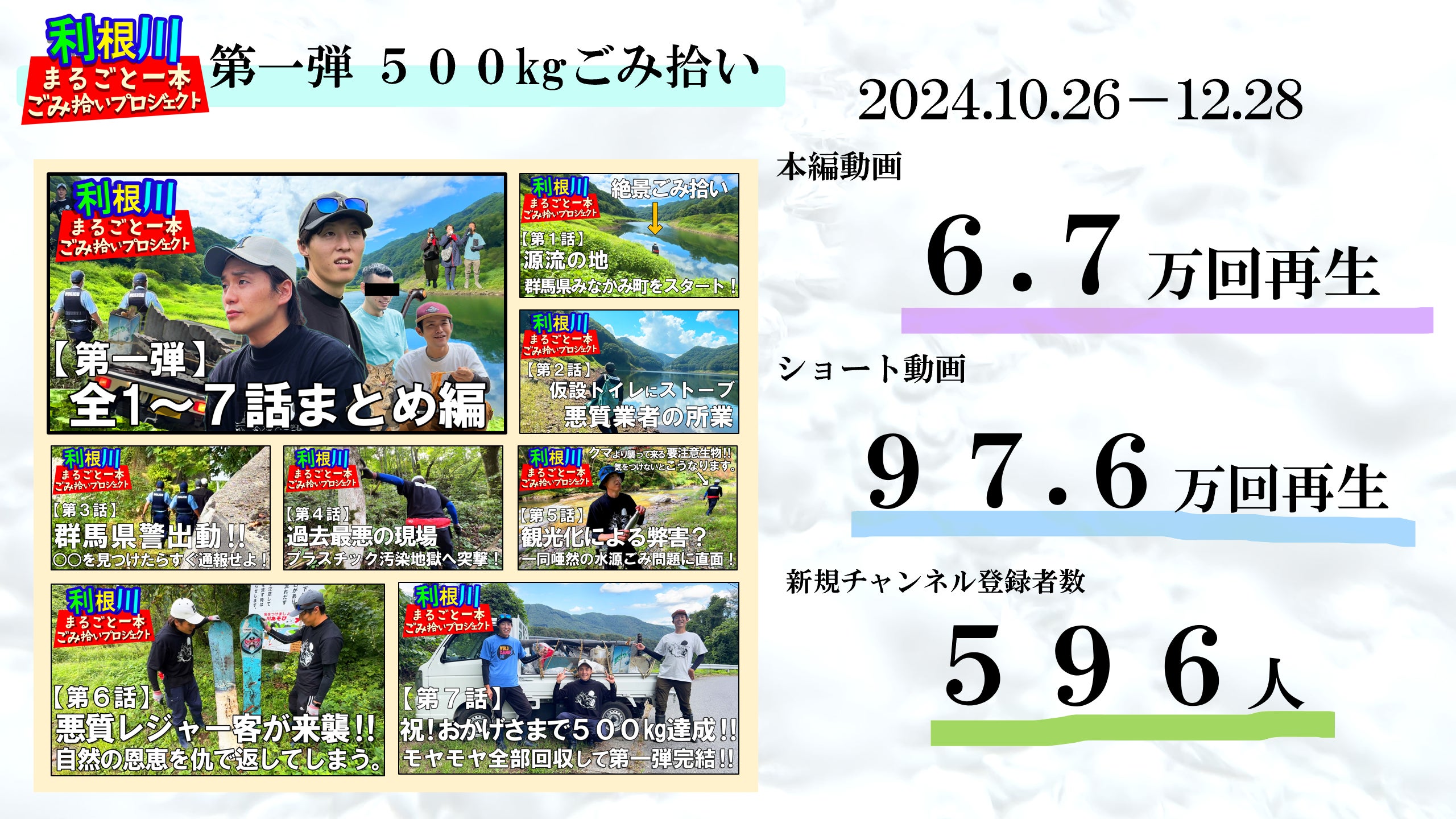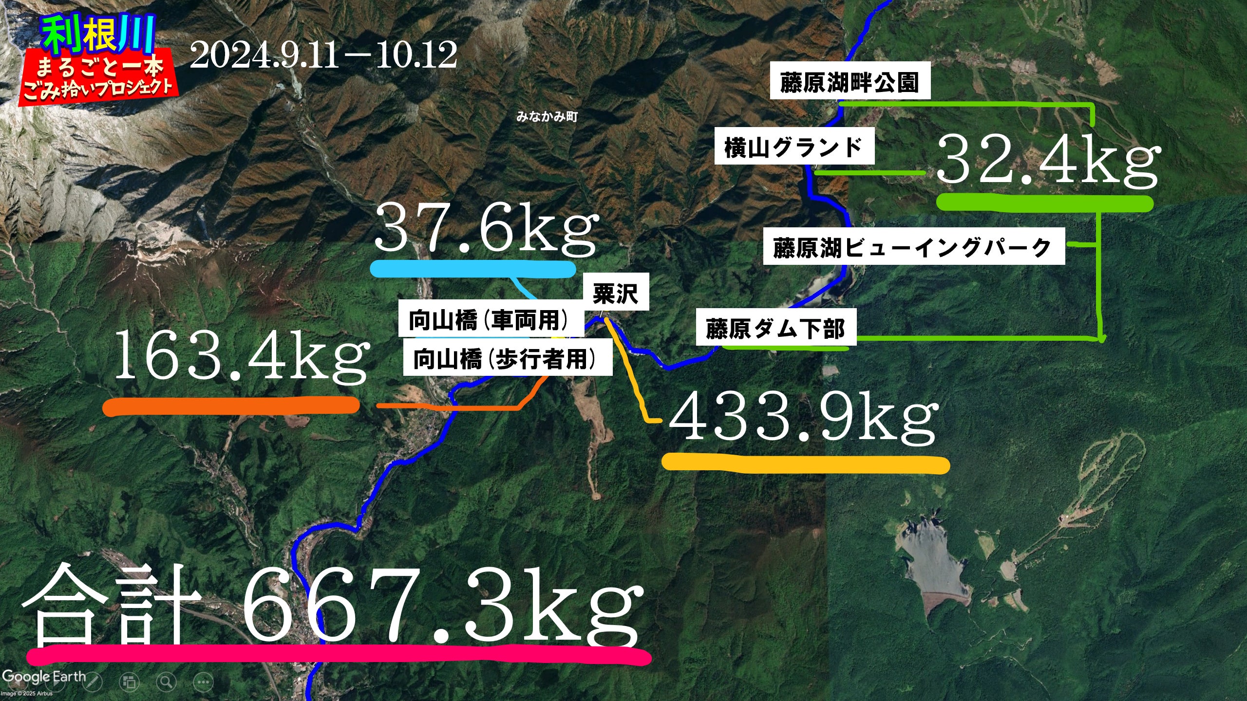 2024年9月に実施した「第一弾 利根川500kgごみ拾い」には、2社の協賛企業と、群馬県みなかみ町をはじめ多くの方々のご支援により、