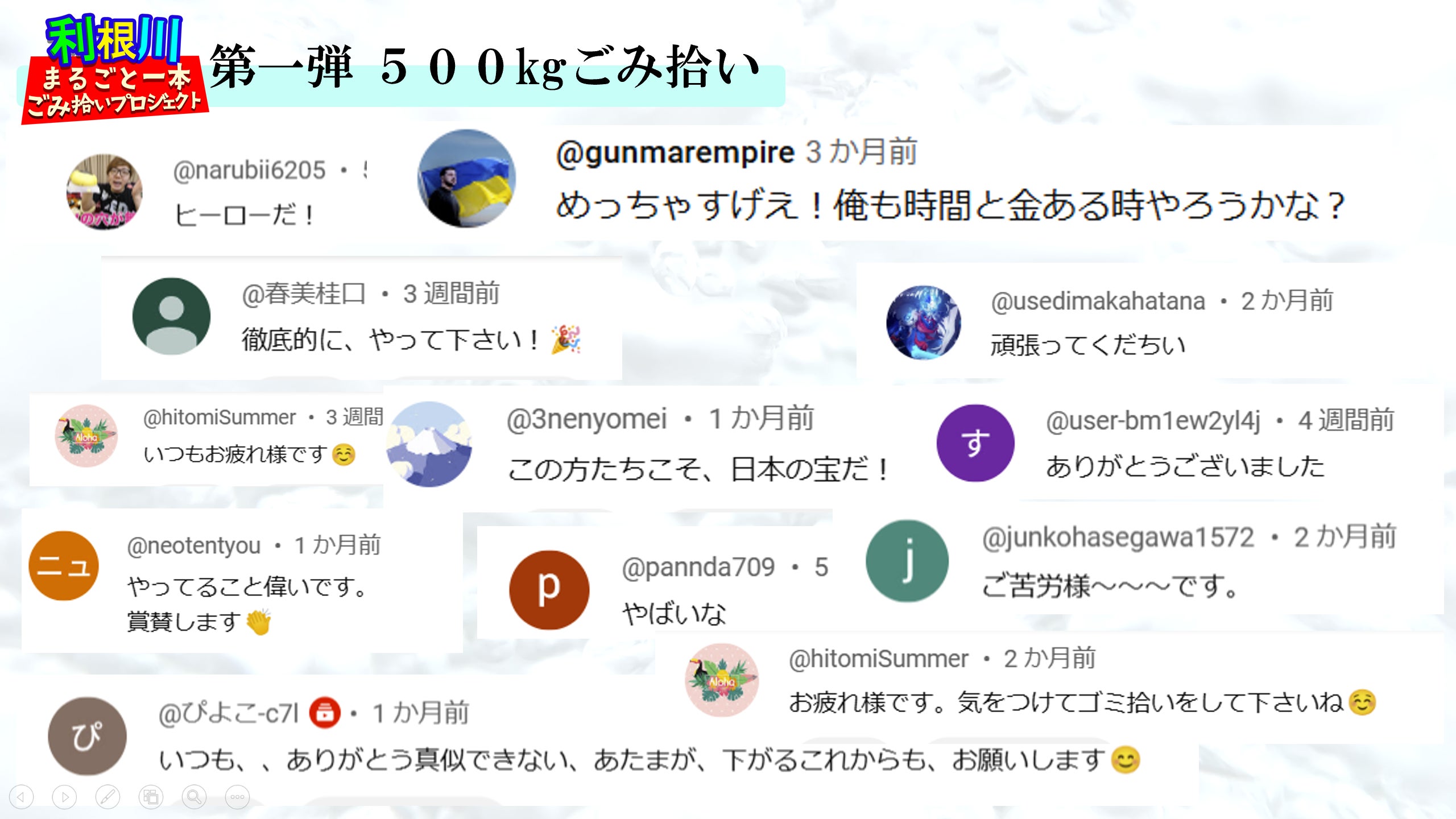2025/07/04 19:00皆さまのご支援のおかげにより「利根川まるごと一本ごみ拾いプロジェクト 第二弾利根川500kgごみ拾い」を無事に終了することができました。心より感謝申し上げます。今回は、利根川沿いの約5.8kmにわたる区間を対象に、合計779.5kgのごみを回収しました!これにより、第一弾と合わせた累計回収量は単位が上がり、約1.4トンです!!また、無事にすべての動画配信が完了し、ご支援いただいた皆様に全貌をお届けできてホッとしております!【 今回の清掃で見えてきたごみの実態】空き缶やペットボトルなどのポイ捨てごみはもちろんのこと、今回は特に家庭ごみや農業資材などの「埋没ごみ」が多く見受けられただけでなく、地中に埋められ、長い時間が経過していたと思われるごみもありました。また、テレビやバイクなどの不法投棄の現場にも多数遭遇し、その深刻さを改めて実感しています。川辺の橋の下や大きな樹の下には、バーベキュー後と見られる飲食ごみが残され、ラフティングのスタート地点には、衣類・食品の残骸、プラスチック・ゴム片などが散乱していました。こうした現場を目の当たりにし、清掃活動の重要性と同時に、発生源対策や啓発活動の必要性を強く感じている次第です。【第三弾を2025年9月に実施予定】「利根川まるごと一本ごみ拾いプロジェクト」は、単なる清掃イベントではなく、活動自体を成立させることで活動を全国へ拡大させ、日本を世界一安全で豊かな水資源の国にすることが最終目標です!そして、SDGs(特に目標14「海の豊かさを守ろう」、目標15「陸の豊かさも守ろう」)を実践する持続可能な環境アクションを世界へ展開させたいと考えています!今回の第二弾は、第一弾よりも多くの方々にご参加いただいてパワーアップした結果、前回以上のごみを回収することができました。9月に実施予定の第三弾においても、高い環境意識と公共性を兼ね備えたみなさんと次の活動でもご一緒できることを楽しみにしております!今後ともどうぞよろしくお願いいたします!またお会いしましょう!!※現在、返礼品の準備を整えているところでございます!順次、メッセージをお送りいたしますので、お手元に届くまでもう少々お待ちくださいませ! もっと見る