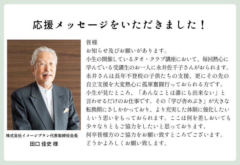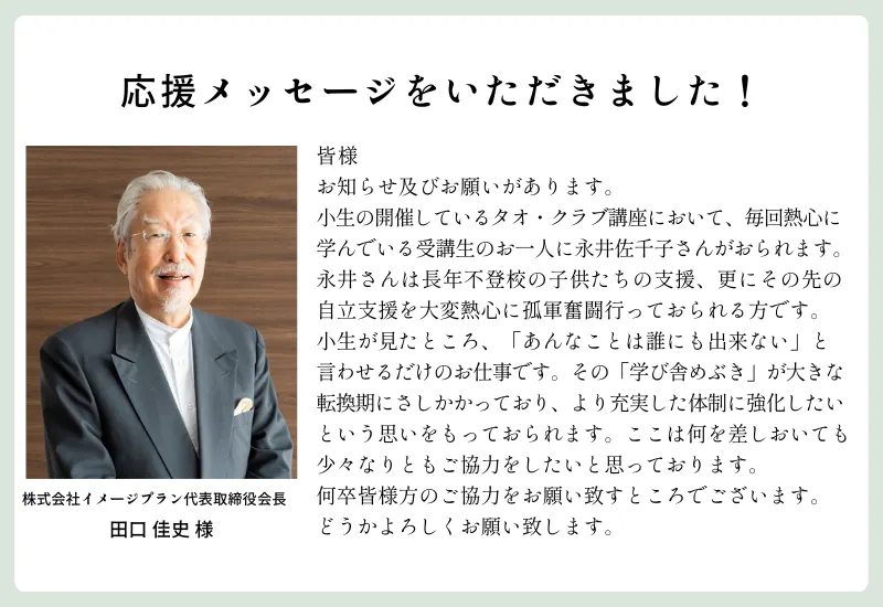 学び舎めぶき代表の永井が長年学ばせていただいている、東洋思想研究家の田口佳史先生より、とても力強い応援メッセージをいただきました。