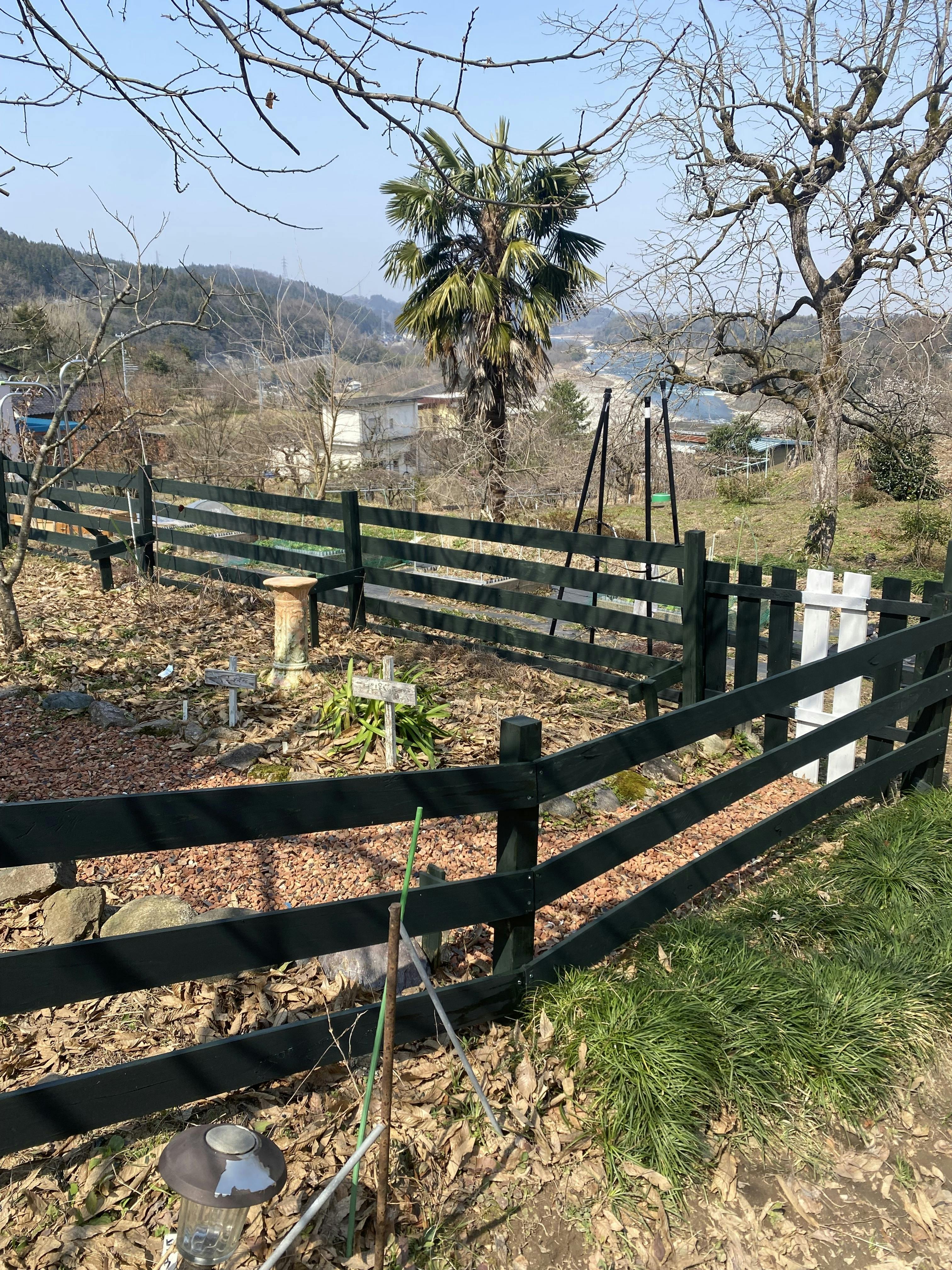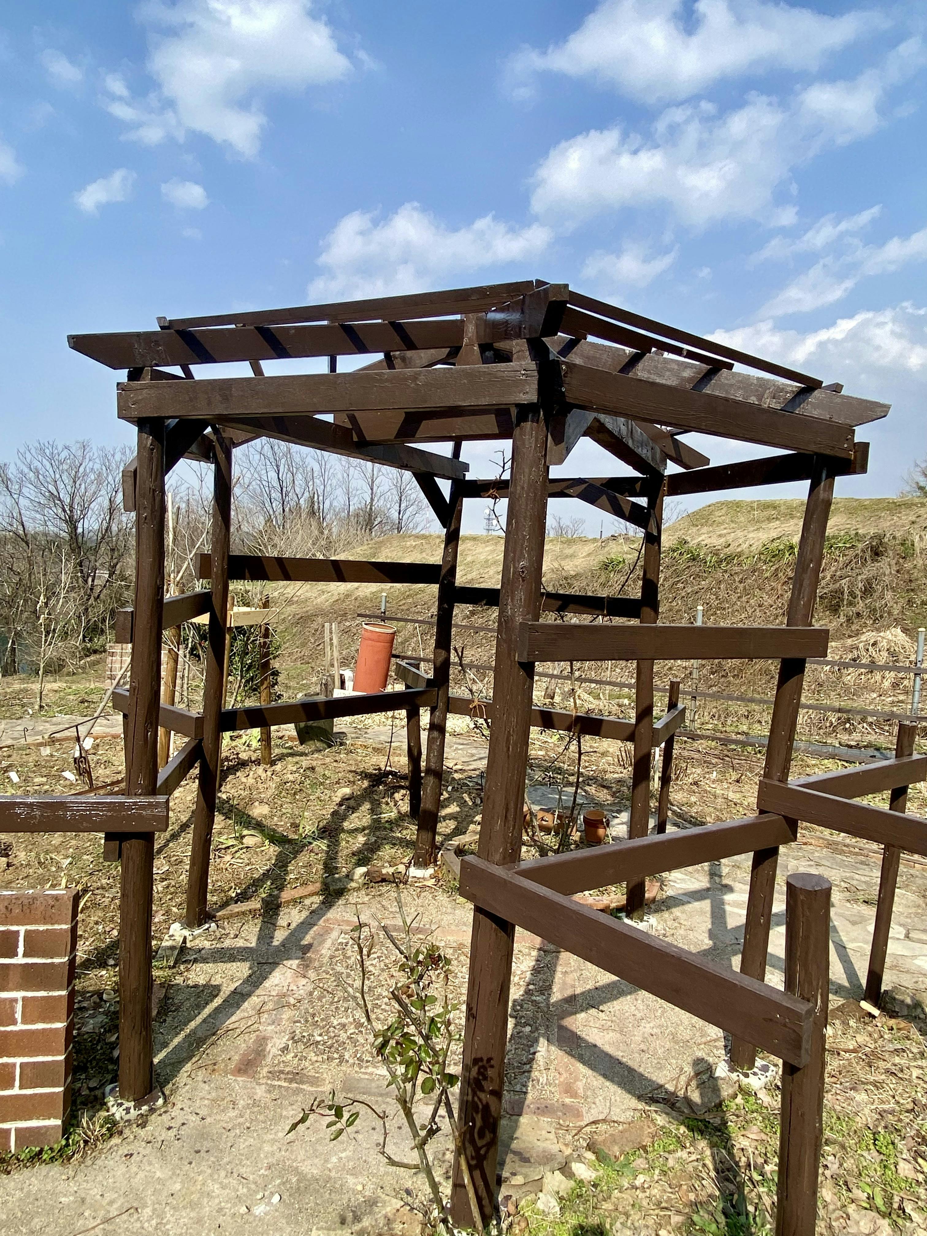 雪で壊れてしまった庭の柵や薔薇のガゼボは修理が終わり、色褪せたペンキを友人たちと塗り直しました。