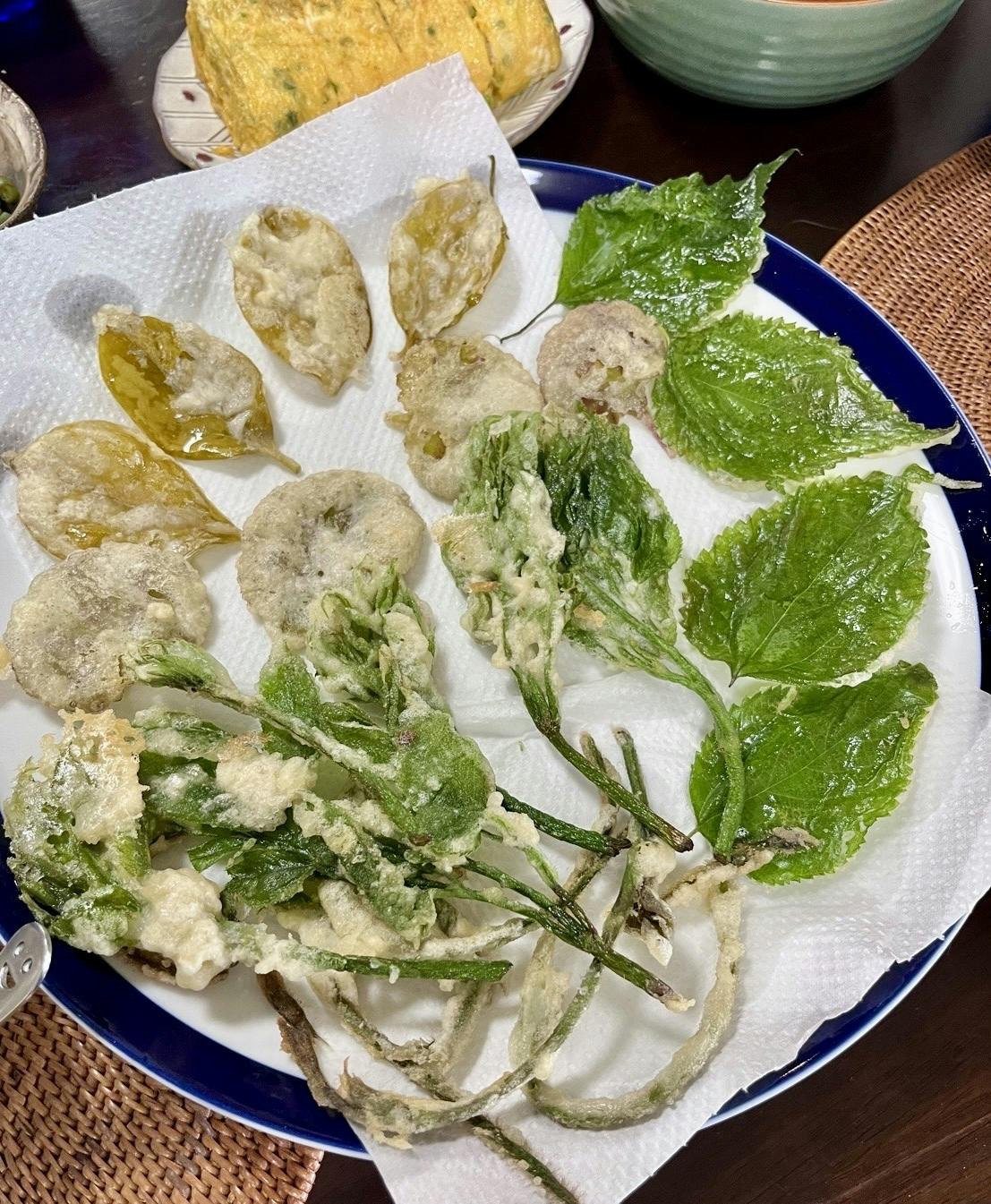 野草の天ぷら(柿の若葉・カラムシ・葛の蔓・ウド・蕗の葉・ドクダミ)