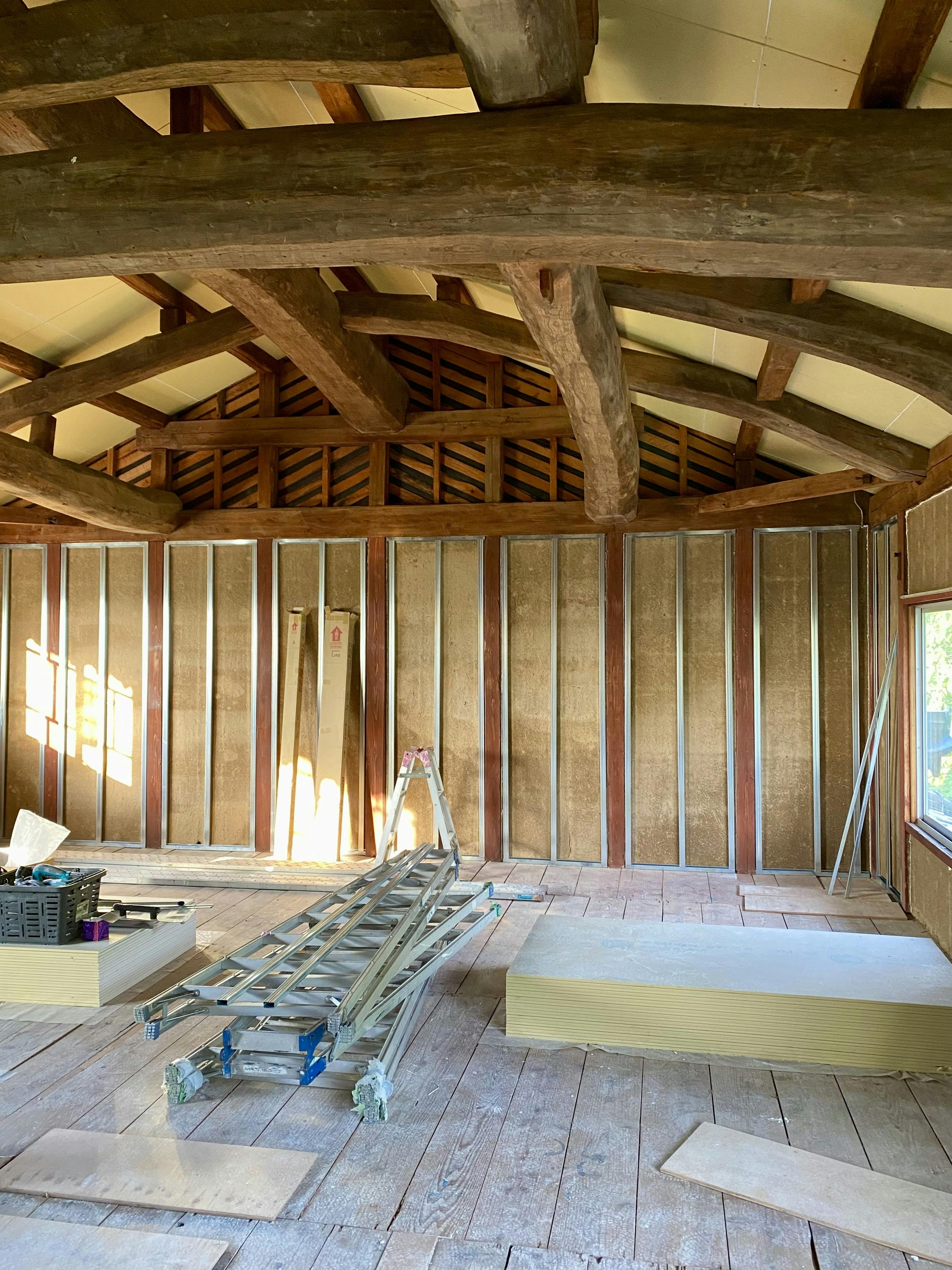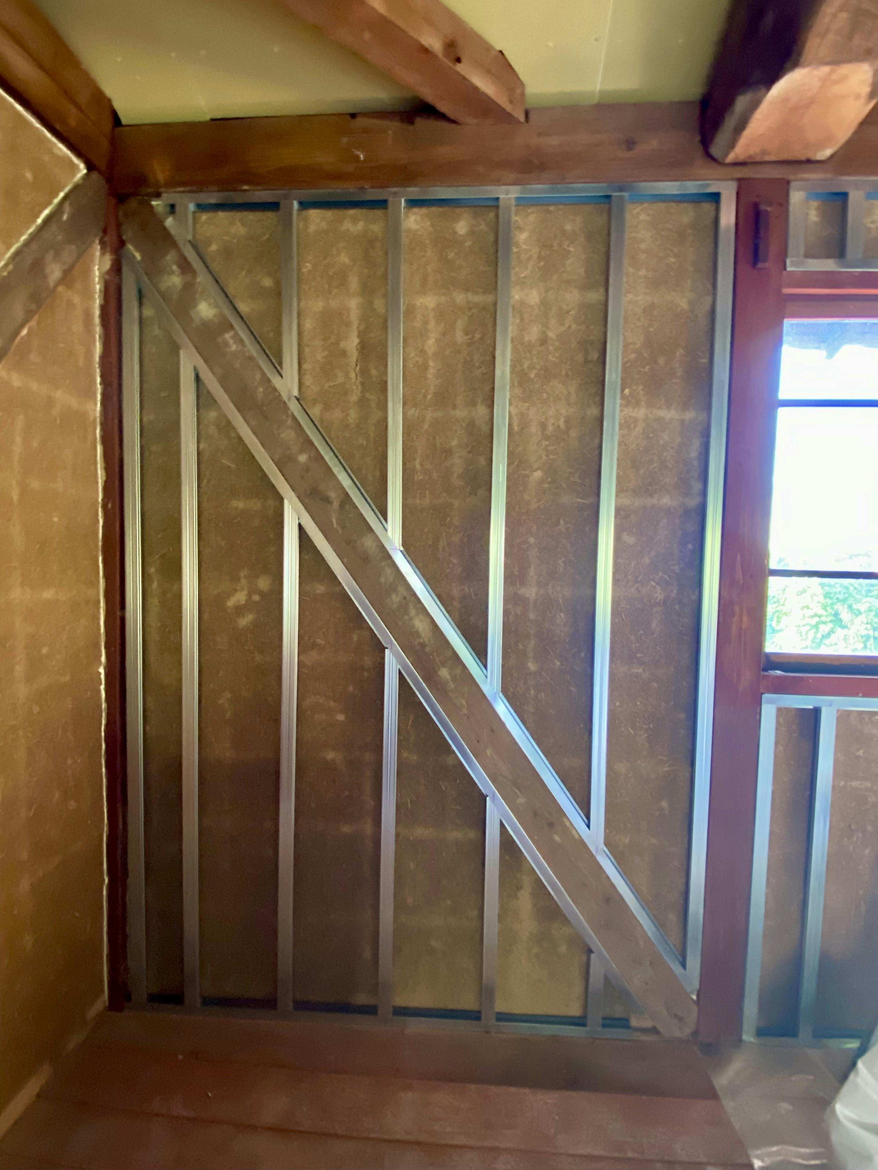 さて、2階の天井の石膏ボードが貼られ、今は壁面の作業中です。
