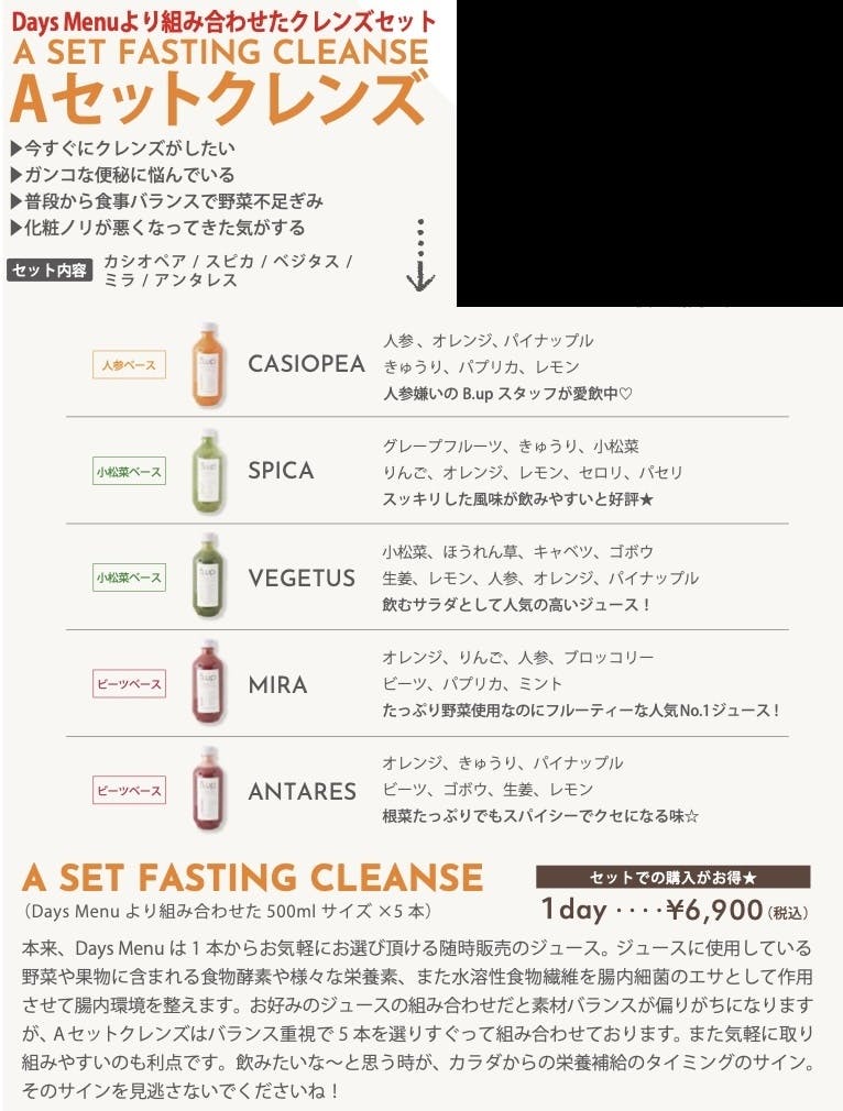 ビーアップご来店時 ジュースの中でも大人気のファスティングAセットを2セットお渡しいたします