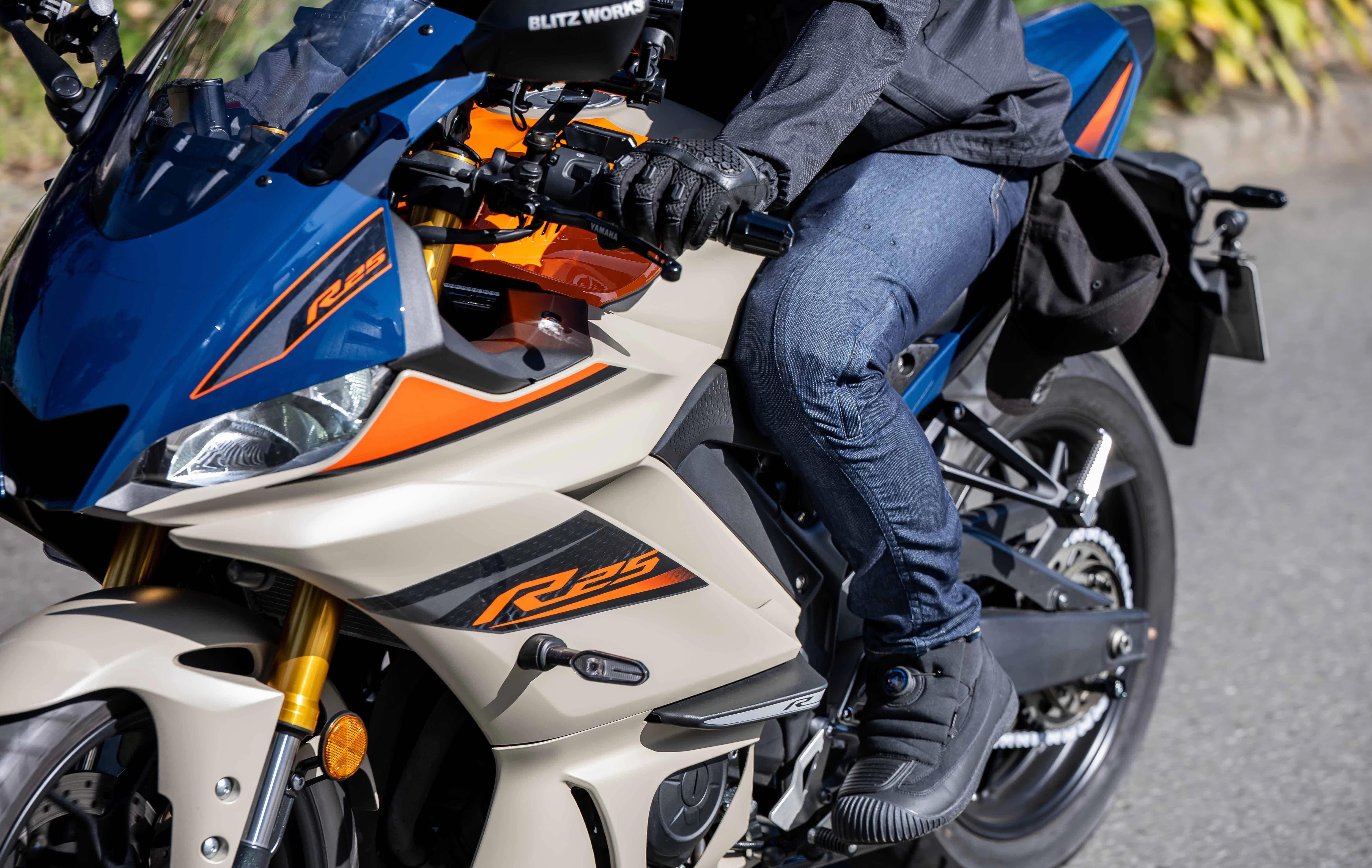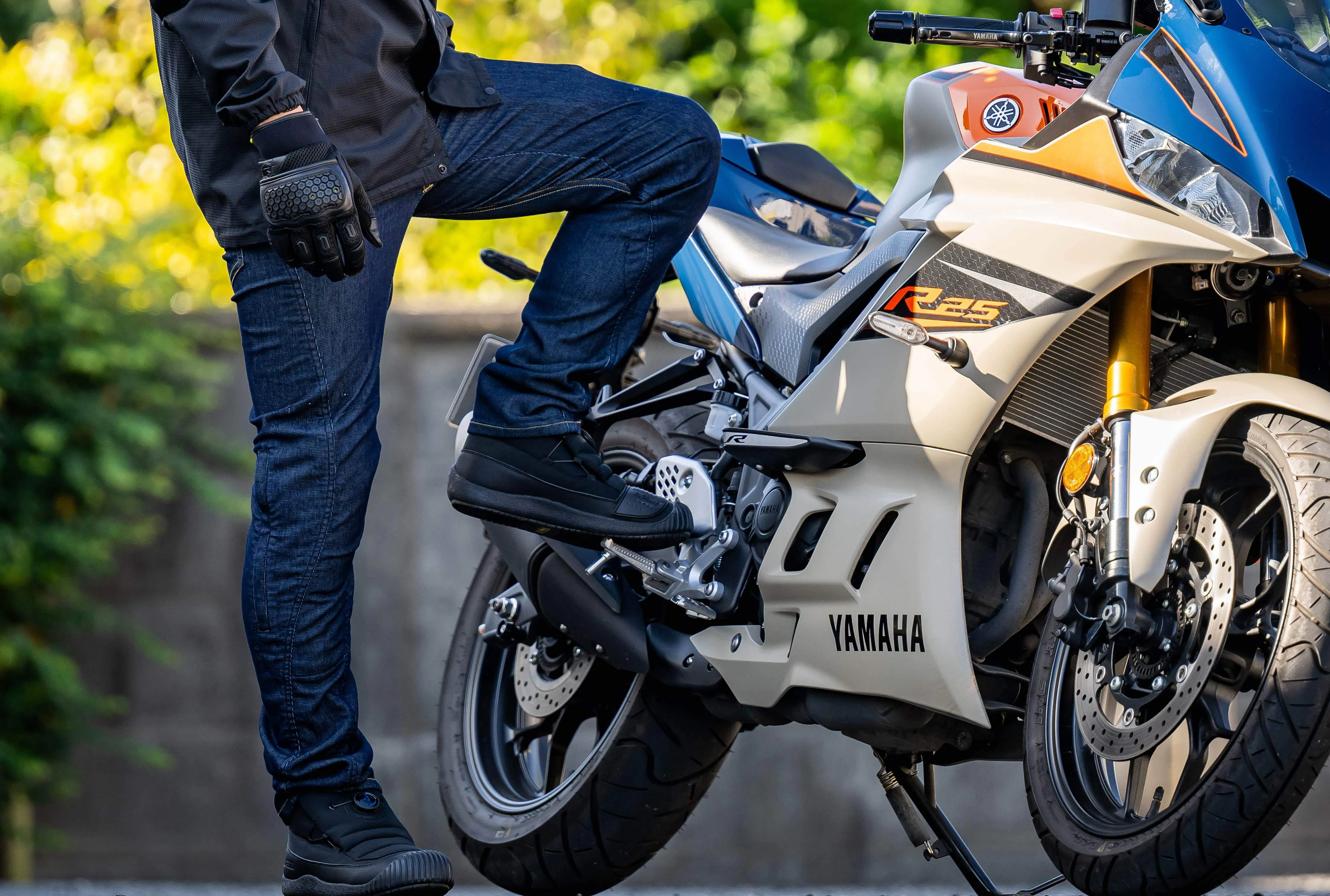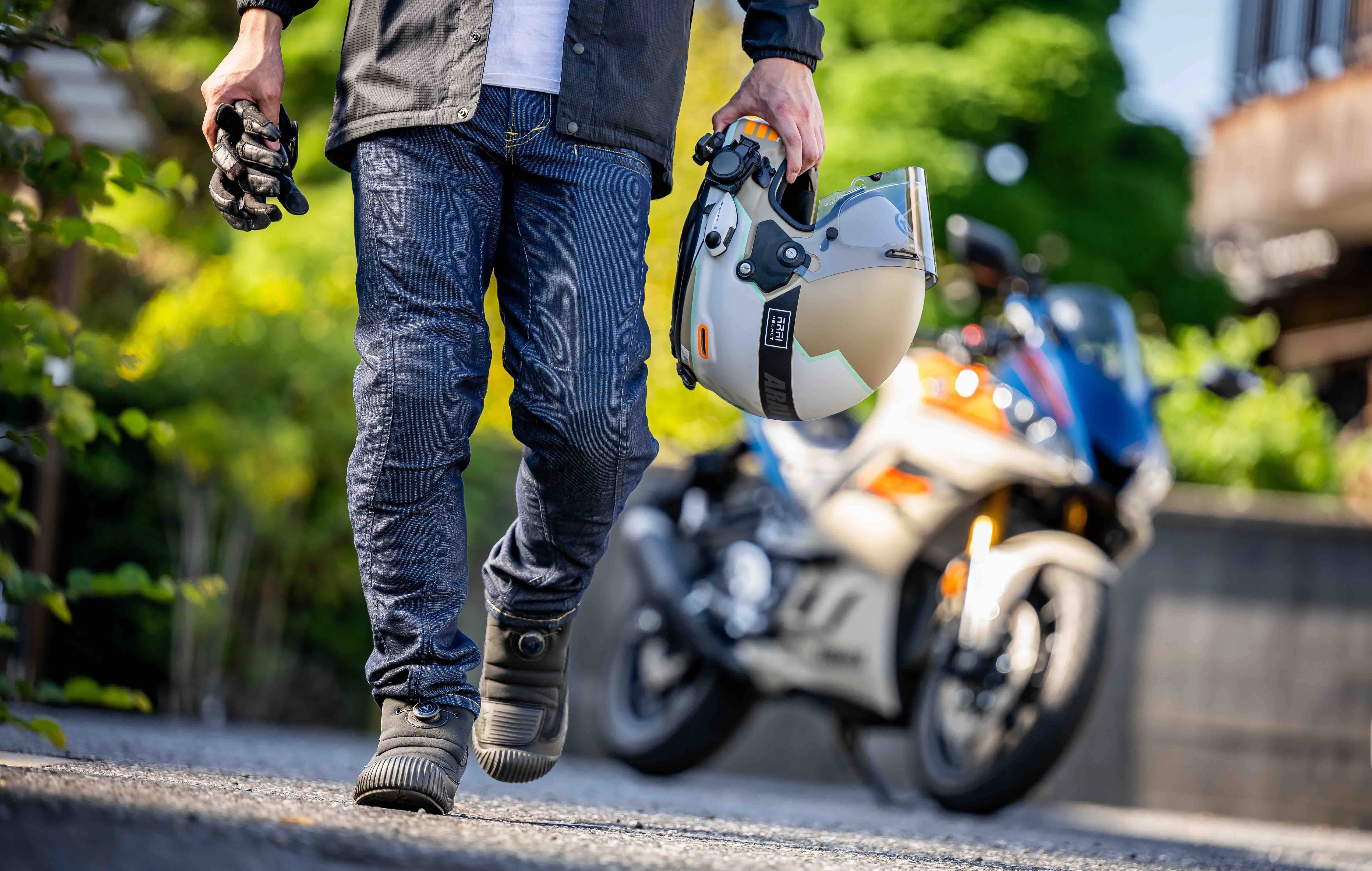 乗る時は膝のプロテクターを装着。バイクから降りたら膝からプロテクターを外して街を歩いて下さい。絶対に!絶対に!バイク用だとは気付かれません(笑)