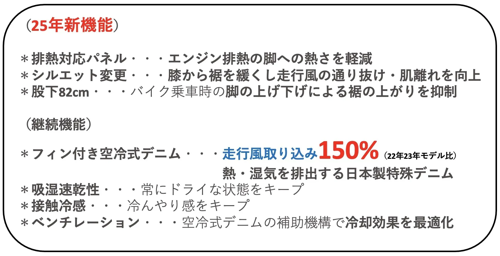 「夏のライダーを救う」という熱い想いのみで、あるようでなかった【空冷式ジーンズ】を開発して4年。走行風取り込み150%の空冷式デニムの性能はそのままに2025年モデルチェンジしました。