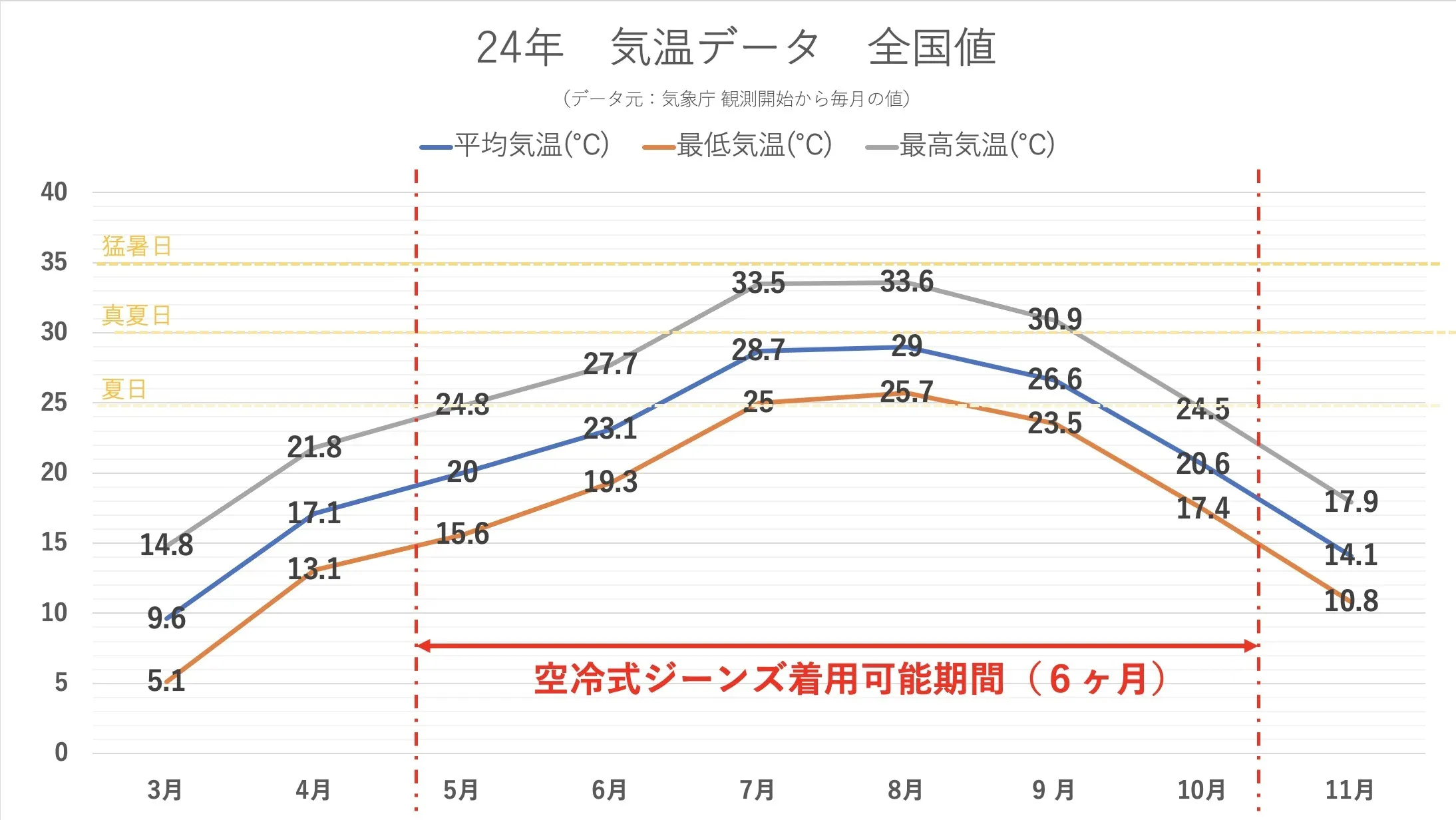 5月から夏日(気温25℃)が開始します。そこから真夏日(気温30℃)、猛暑日(気温35℃)が9月まで続きます。記憶に新しいと思いますが10月も夏日が多いんです。地球温暖化が著しいですね(涙)