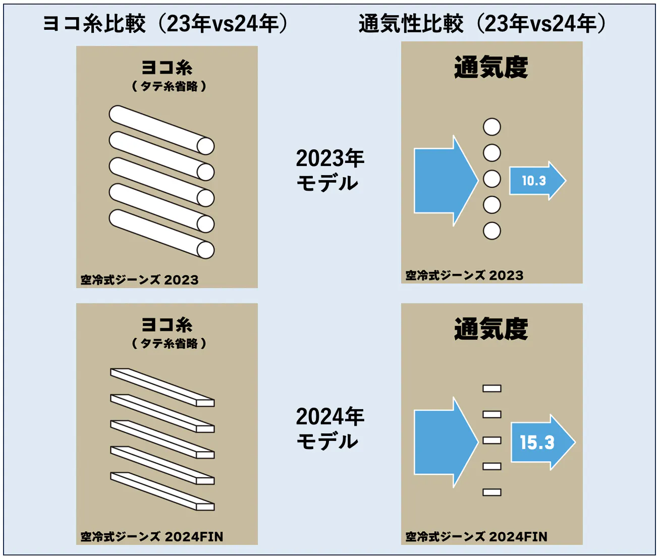 もちろん!使用しているデニムは24年と同じ走行風を取り込む【フィン付き空冷式デニム】です!