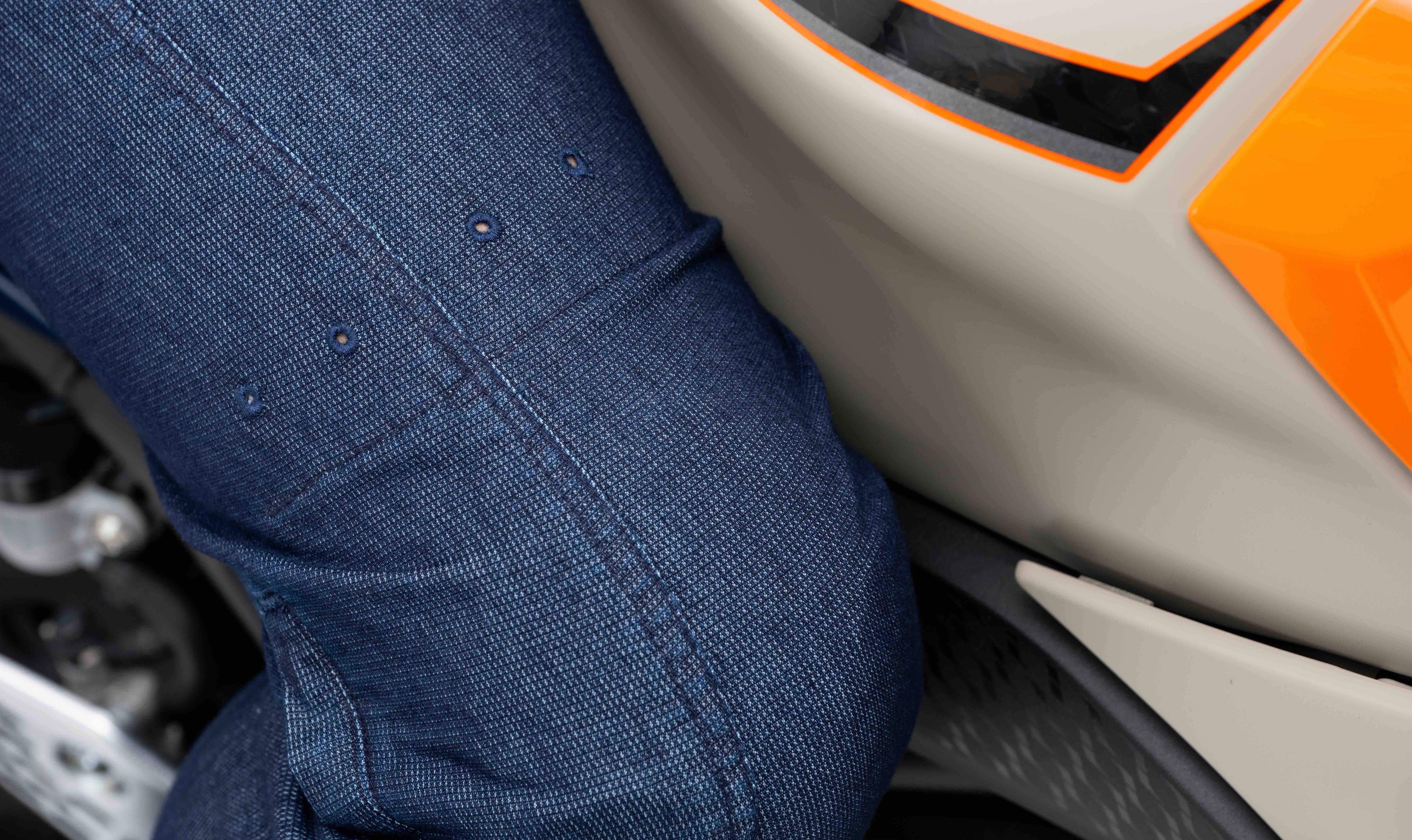 デニム生地がメッシュ構造になってる分かりますか?このメッシュ構造が空冷式デニムなんです。そして3年に渡りライダーの夏を最適にしているんです。