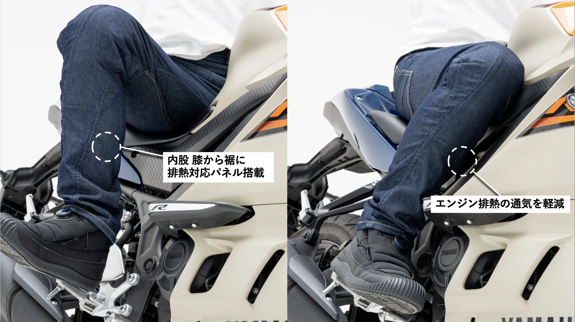 バイクに乗る時の第一動作は「跨り」です。この【空冷式ジーンズ】はバイクにまたがりやすい機能を搭載しています。内股にマチが搭載されています!