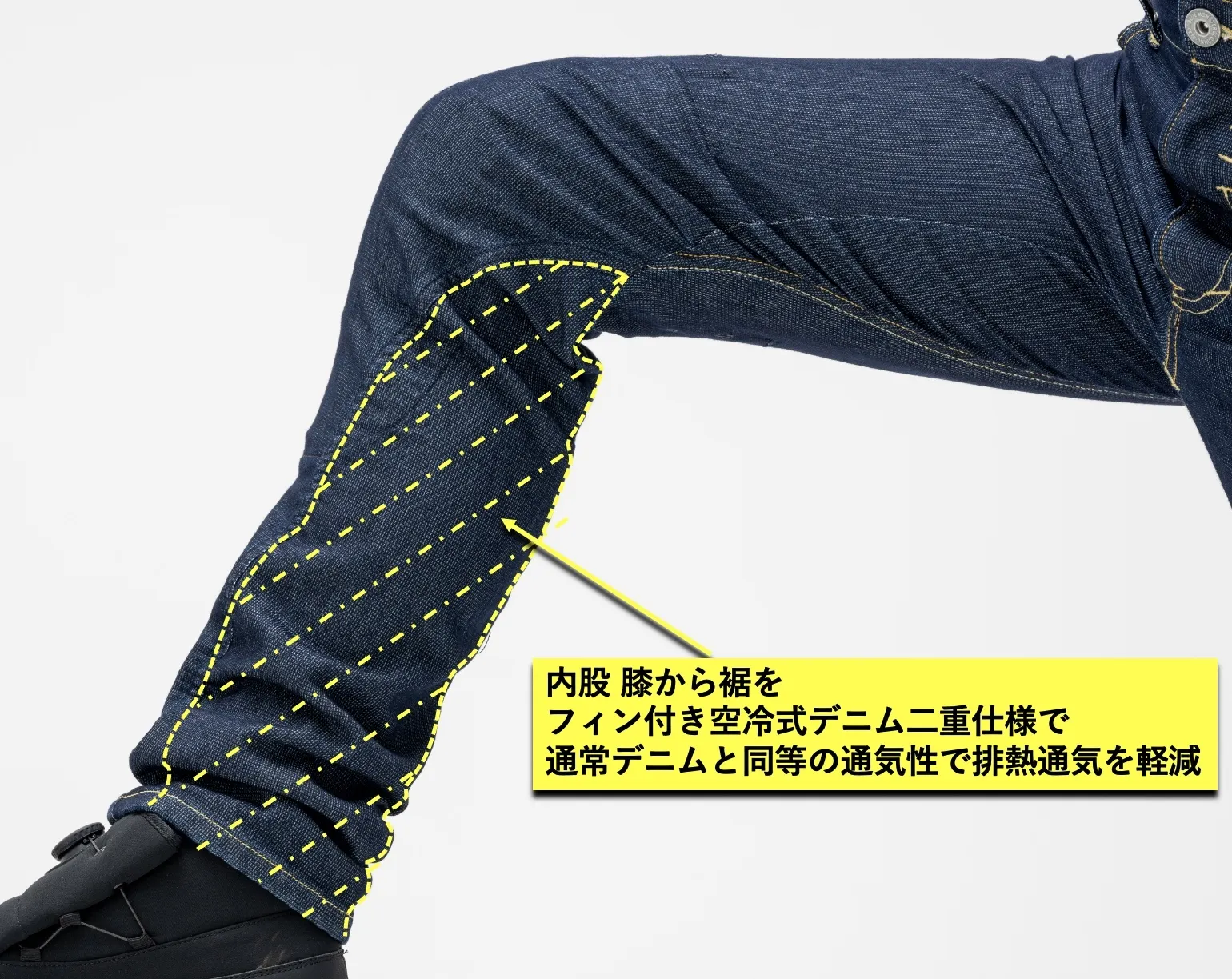 走行風を取り込み下半身を涼しくする仕組みだけでなく、動きやすさを追求した日本の技術により生み出された高機能デニムがフィン付き空冷式デニムなんです。