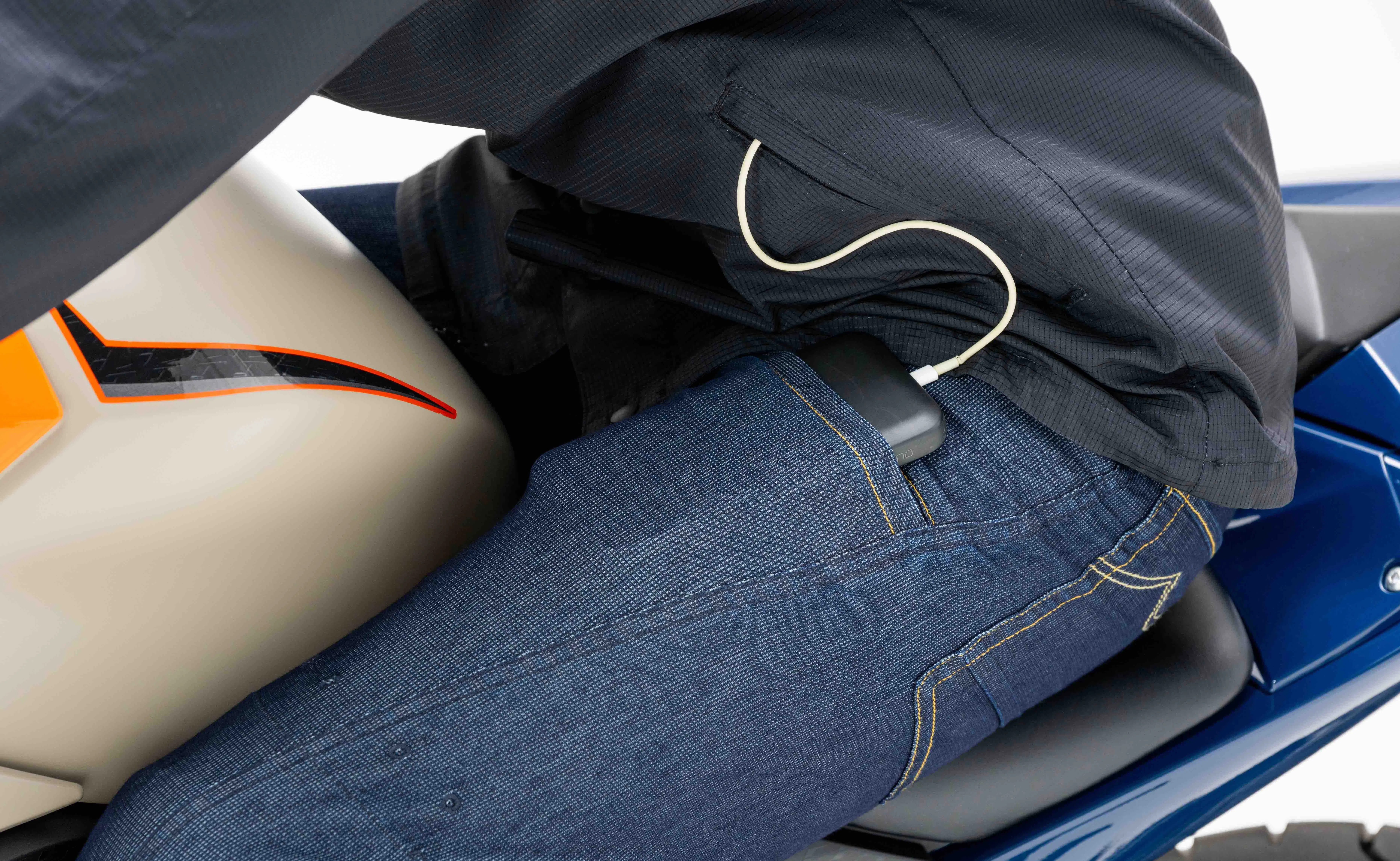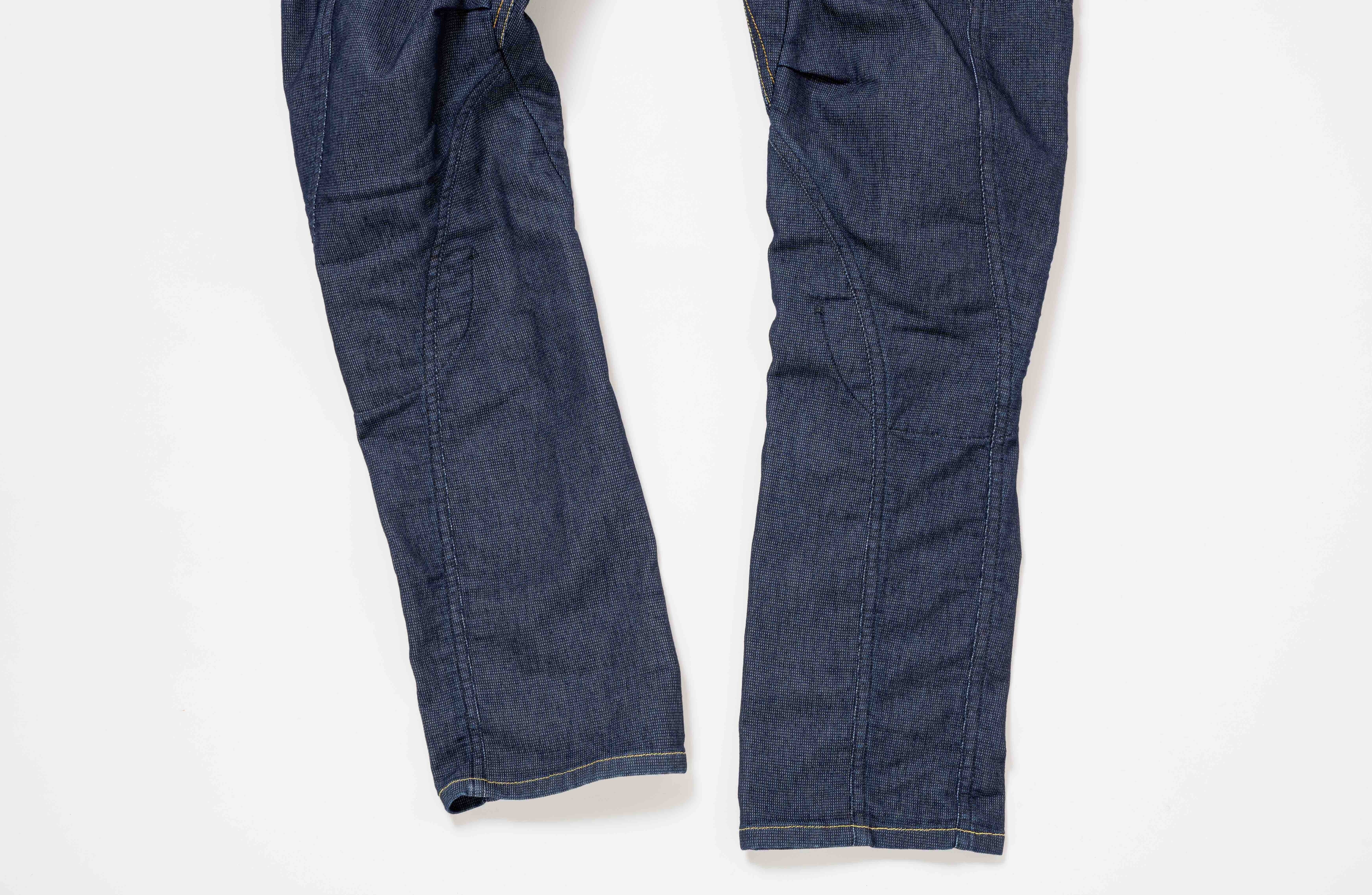 そして、股下が82cmになった事で、乗車時の見た目も安心になりましたが・・・停車発進時の脚の上げ下げで裾が上がってくる現象を緩和する事ができています!これ地味な改善ですが【空冷式ジーンズ】においては非常に重要な改善となっています。