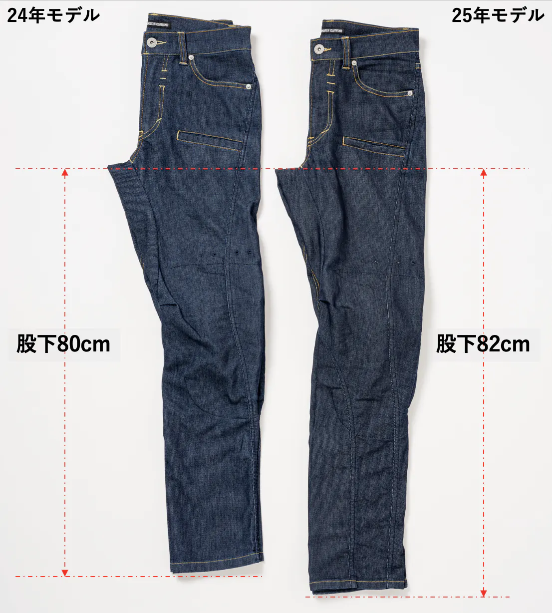 分かりますか?左が24年モデル。右が25年モデルです。膝から裾までにゆとりがあります。そして・・・股下が82cmになったので生地が余っています(涙)