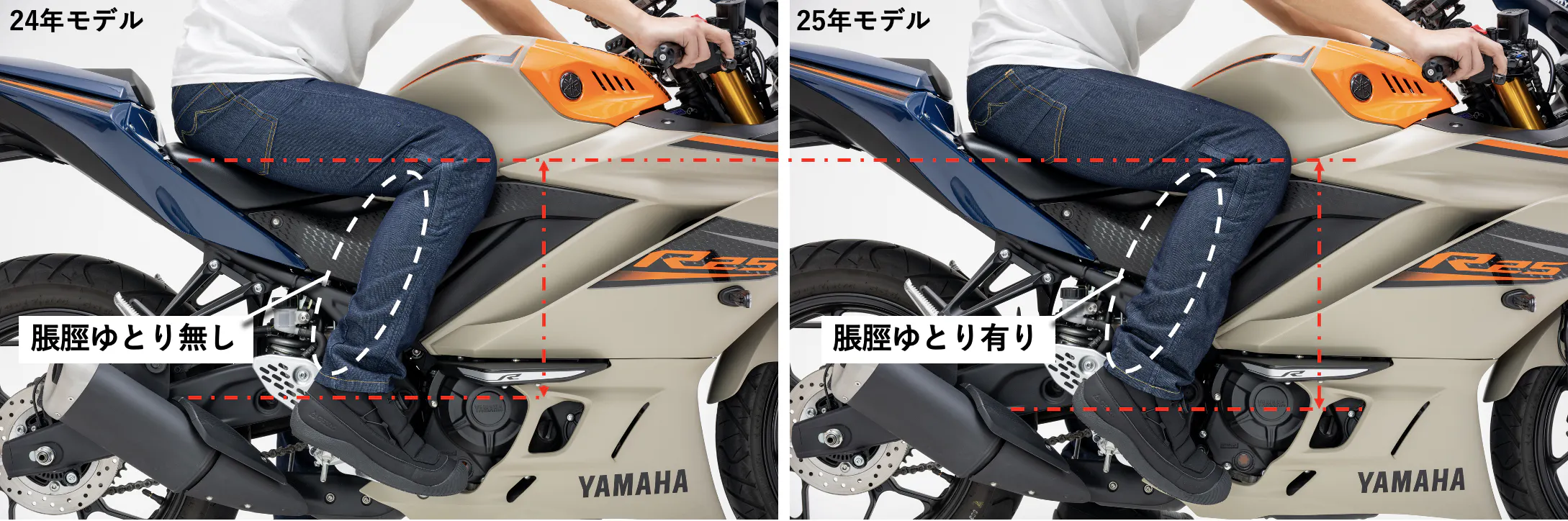 左が24年モデル。右が25年モデルです。過去モデルはバイク乗車時に脹脛がパツパツになります。前面から取り込んだ走行風は効率的に抜けて行きません。膝から裾が緩くなった25年モデルは脹脛にゆとりができました。取り込んだ走行風は効率的に抜けて行く様になりました。ありがとうございまぁーすぅ!