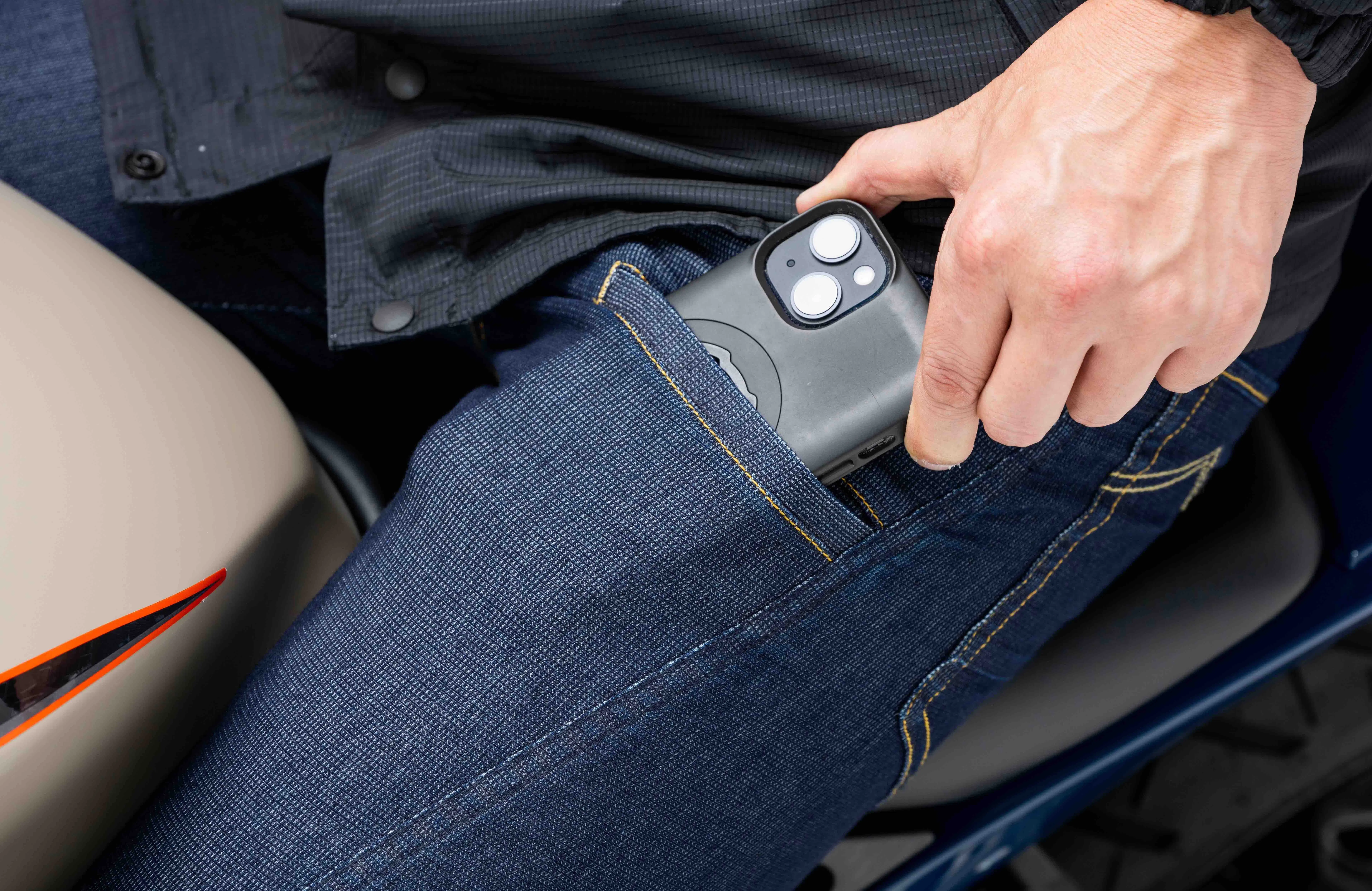 「バイクに乗った時にスマホの収納場所に困ってませんか?」地味だけど超絶便利なスマホ専用ポケットが【空冷式ジーンズ】には標準装備されています!BMCバイク用ジーンズにはデフォルトのスマホ専用ポケットですよね(笑)