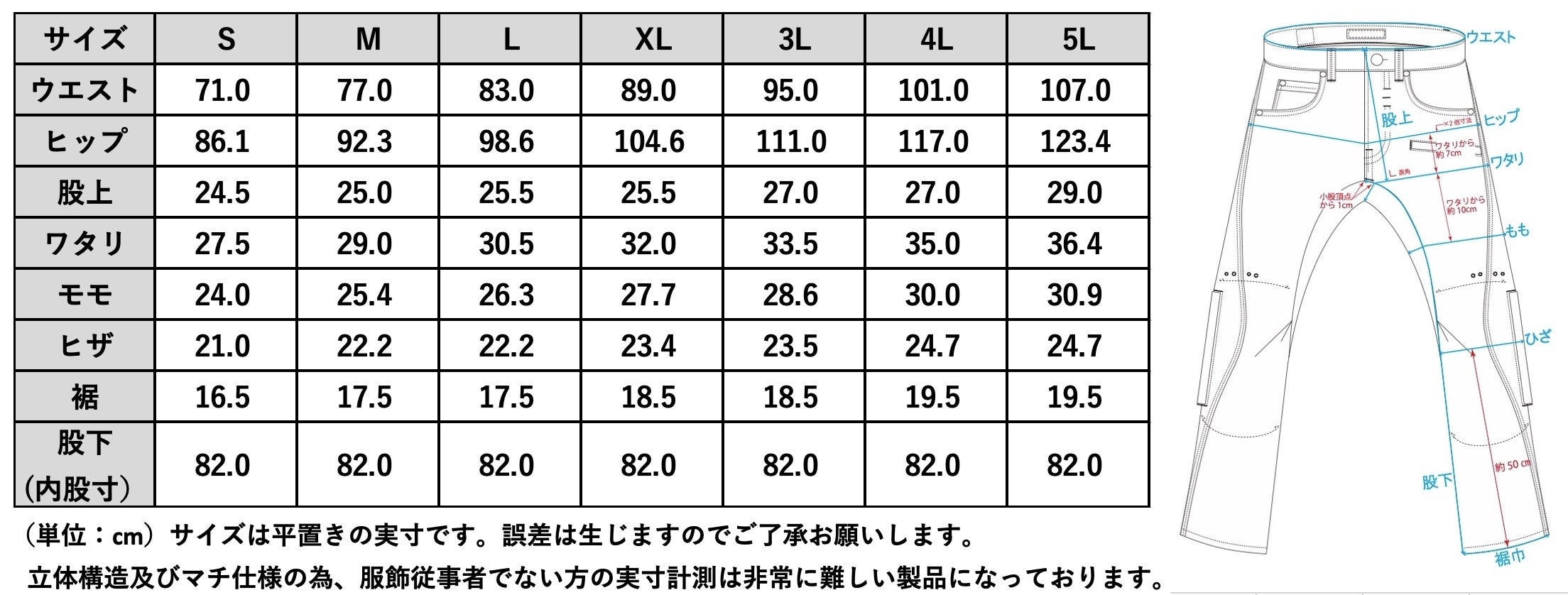 -ウエストサイズ:S(28inch/71cm)、M(30inch/77cm)、L(32inch/83cm)、XL(34inch/89cm)、3L(36inch/95cm)、4L(38inch/101cm)、5L(40inch/107cm)・・・下記寸法表参照