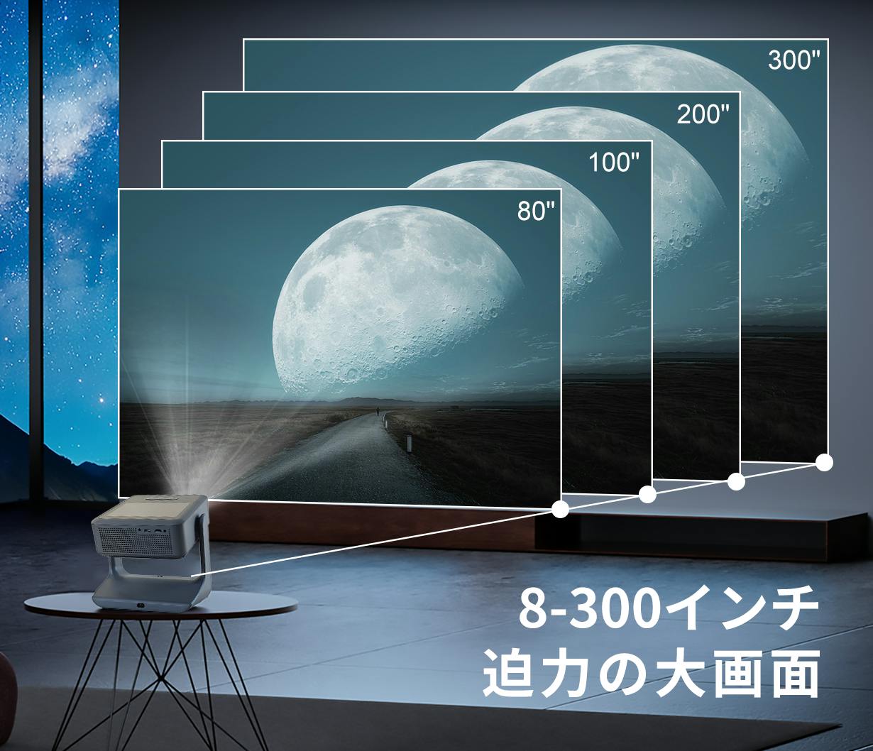 DONGYINGは投影サイズを8インチから最大300インチまで自由に調整可能。