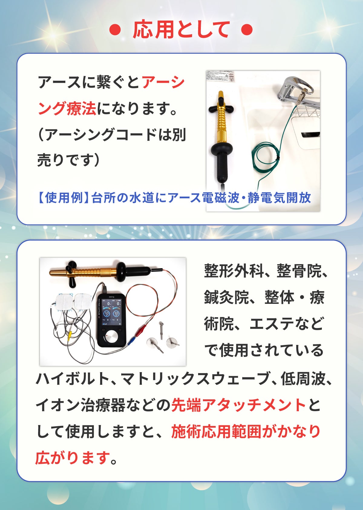 ヒーリングハンズ®ツール1本で10種類以上のバリエーション施術が可能なため、その応用範囲の広さは他社商品の追随を許さないでしょう。