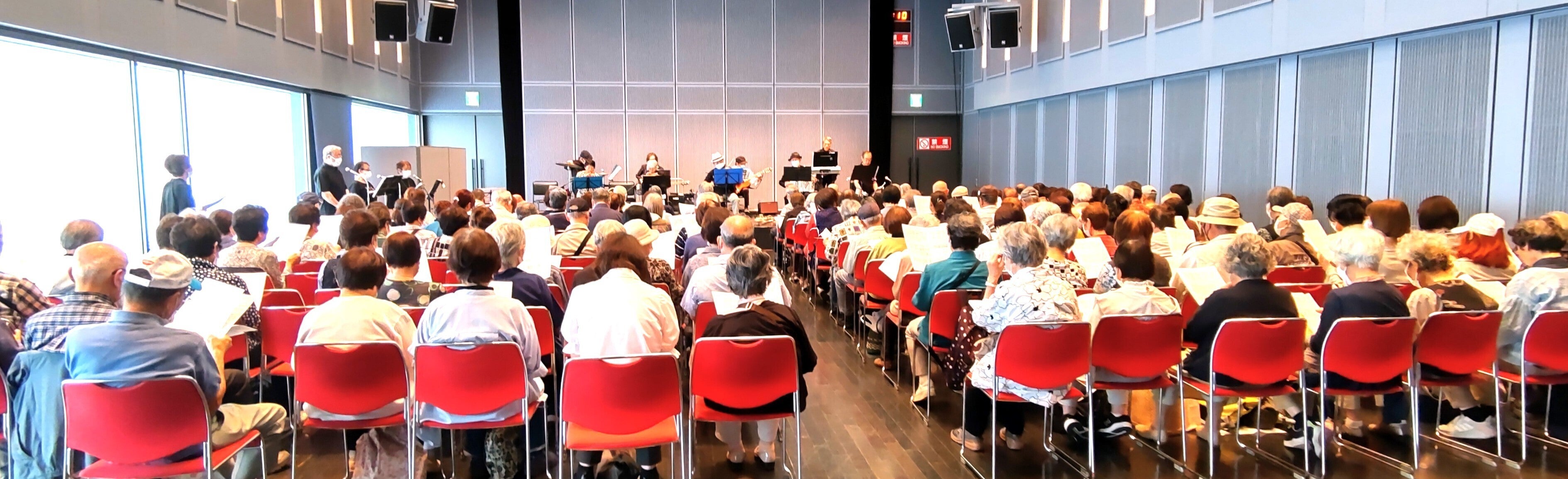 ライブは偶数月に行い、昭和懐メロを中心に、楽団の生演奏と一緒に皆で歌います。