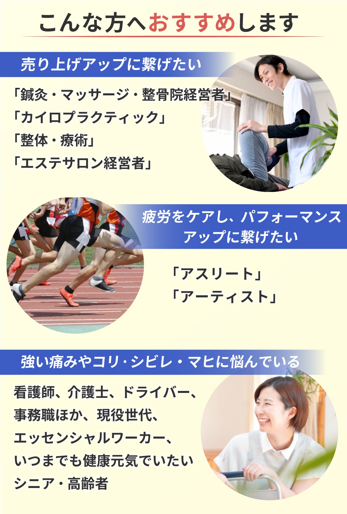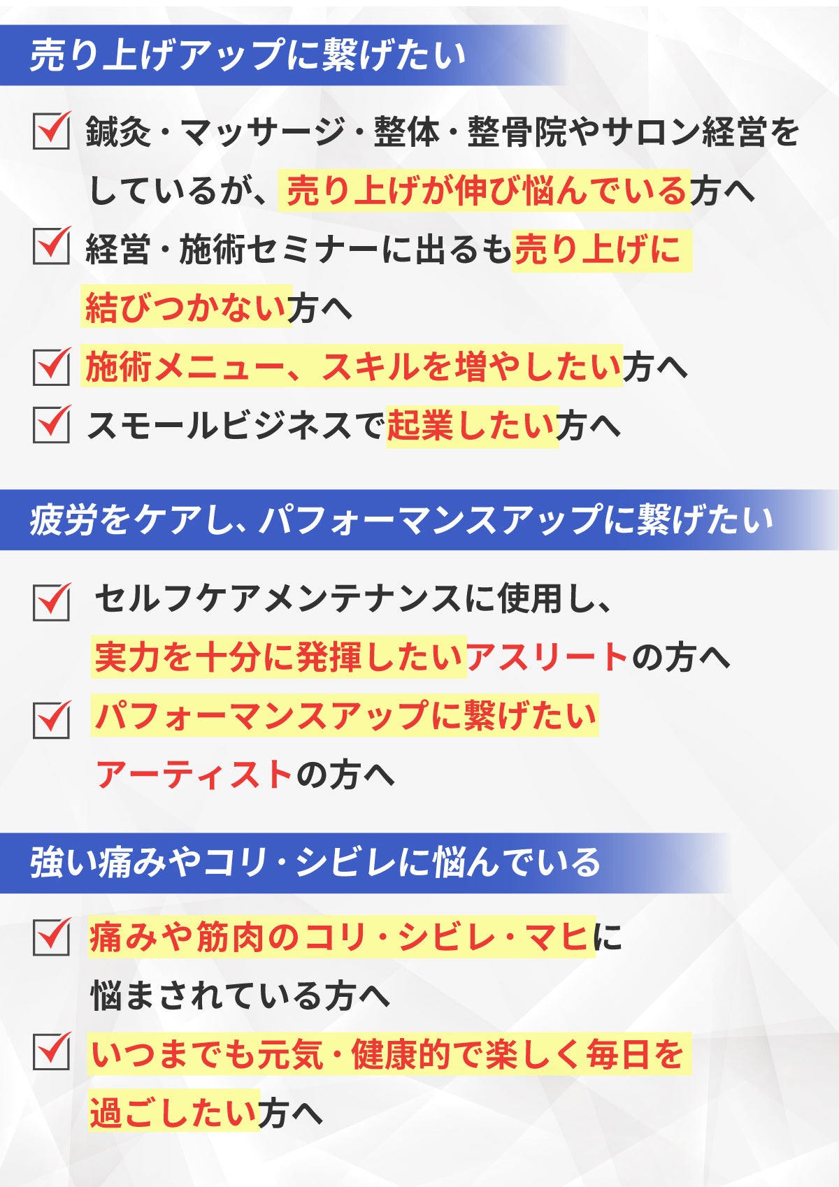 あなたの身体の強いコリや痛み・疲労から解放されることで心理的なストレスも解消して仕事や、スポーツなどのパフォーマンスアップが期待できます。