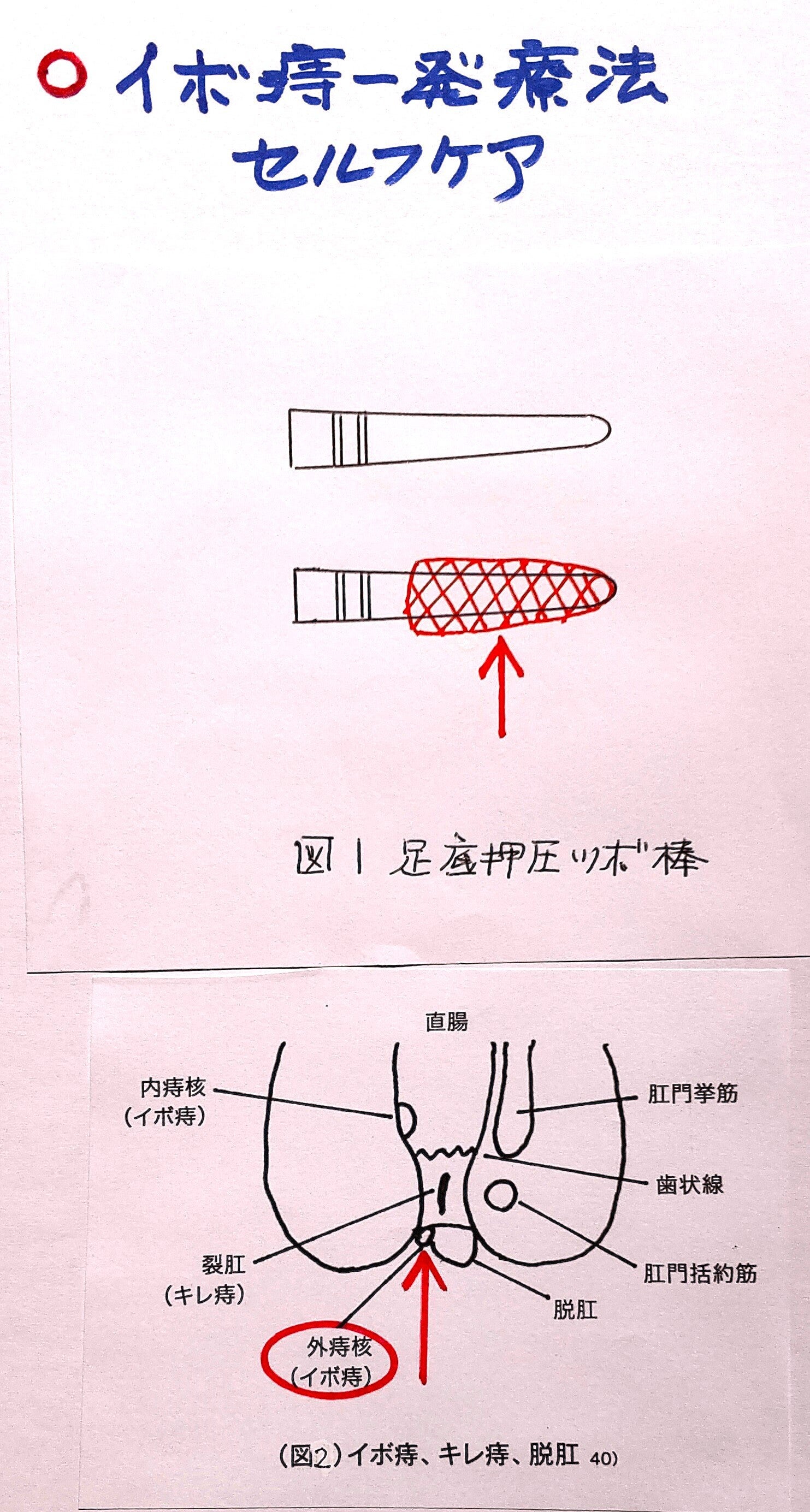 2025/03/31 00:00イラストの市販・足底押圧ツボ棒(100均ショップに有り)やヒーリングハンズ突起部を利用して、簡単にイボ痔の不快感や痛みを、緩和改善することができます。セルフケアの順序(1)イラスト図1の様に使用するツールの先端に、清潔な薄く軟らかい食 品用透明ラップを2~3重にしっかり巻き付けます。(2)使用ツール先端にオリーブオイル、馬油など皮膚にやさしいオイルをたっぷり塗ります。適当なオイルがない時、食用油でもOKです。次に、押圧するターゲットのイボ痔にもたっぷりと塗ります。(3)準備できたら、ターゲットのイボ痔部位をツール先端で15~20秒くらい押圧します。この時、肛門内部や粘膜を傷つけないように注意してください。押圧によって、膨れたイボ痔が縮小します。セルフケアは、入浴時に行うのが効果的です。使用後、ツールは良く洗浄処理し、使用済みラップは、ビニール袋などに入れて安全に処理してください。※1 このセルフケアは効果的ですが、基本は先ず肛門科、肛門外科専門医を受診してください。※2 このセルフケアは、成人が自己責任において行ってください。 もっと見る