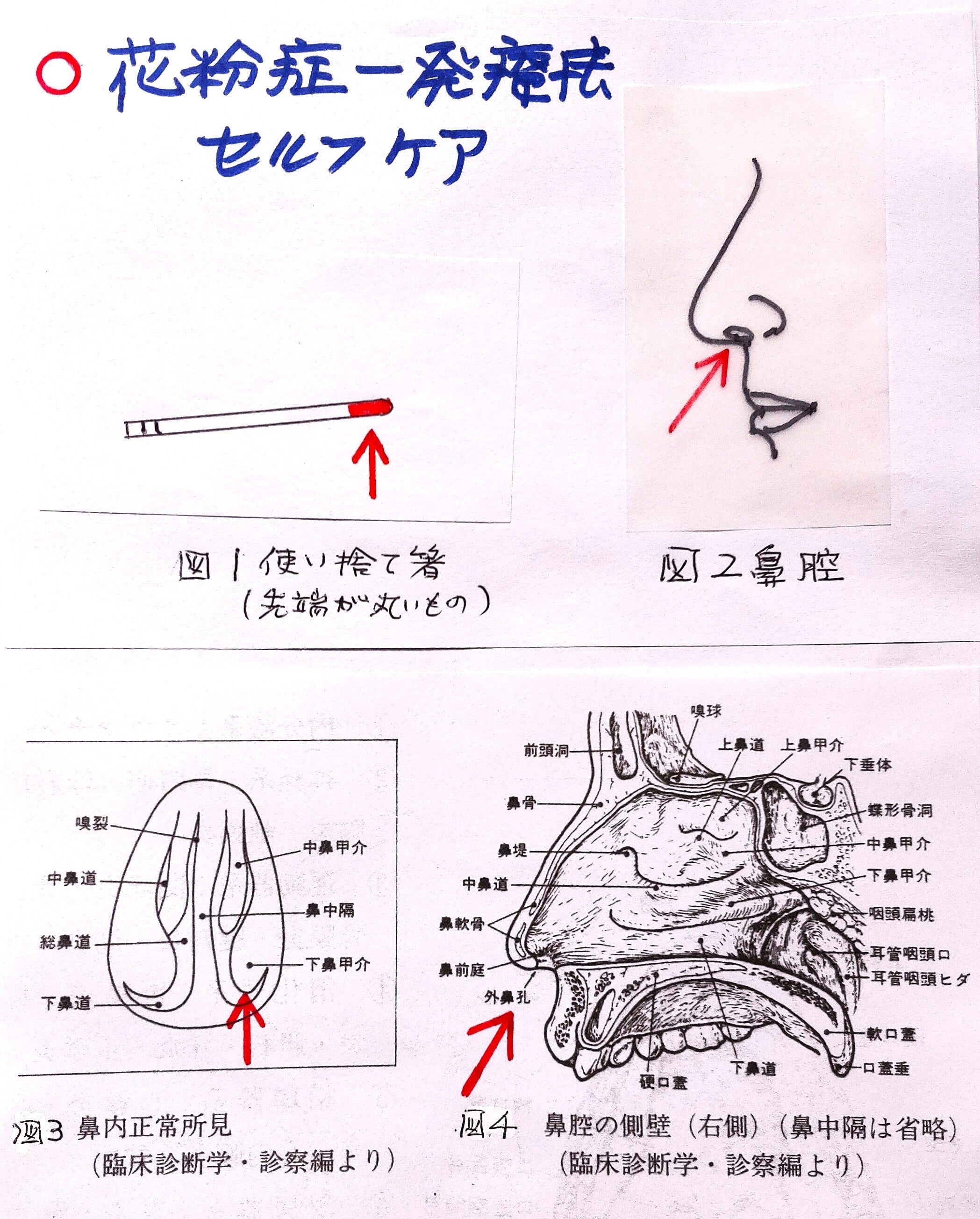 2025/04/03 12:00この時期は,花粉症で悩んでいる人が増加しているので、耳鼻咽喉科にかかっている人も多いかと思います。筆者の、レーザー鍼や光灸(ひかりきゅう)などの開発で、鼻炎や花粉症の施術に応用し著効を得た体験があります。この症例は、耳鼻咽喉科クリニックでも追試で確認済みです。ここでは筆者による、東洋医学的な温熱刺激を鼻腔に刺激すると、1回で改善が期待できる、簡単なセルフケアを紹介します。(1) 先ず、図1にある清潔な使い捨て箸の先端2センチ位を50~60℃に加熱して、その先端を鼻腔に2~3位挿入して、図3,4の下鼻甲介にチクッと感じる程度の刺激を、周囲に3回程押し付けます。反対の鼻腔にも同様に施術します。刺激すると一時的に、クシャミや鼻汁が出ますのでティッシュなどでふき取ってください。一晩寝ると、翌日鼻の通りが良くなってスッキリし、呼吸が楽になっていることが多いです。※注意(1) 鼻の入口周りに熱した箸を接触して、火傷させないように注 意してください。刺激は鼻腔内部の下鼻甲介です。 (2) 箸の刺激温度が低いと効果が出ないことが有ります。 (3) 1回で効果がなかったら、2~3日連続してセルフケアして 下さい。 (4) それでも効果が体験出来ないときは筆者に相談してくださ い。 (5) このセルフケアは、成人が自己責任において行って下さい。 (6) このセルフケアで効果が出ないときは、耳鼻咽喉科専門医の 受診をお勧めします. もっと見る番外編2 イボ痔一発療法セルフケア