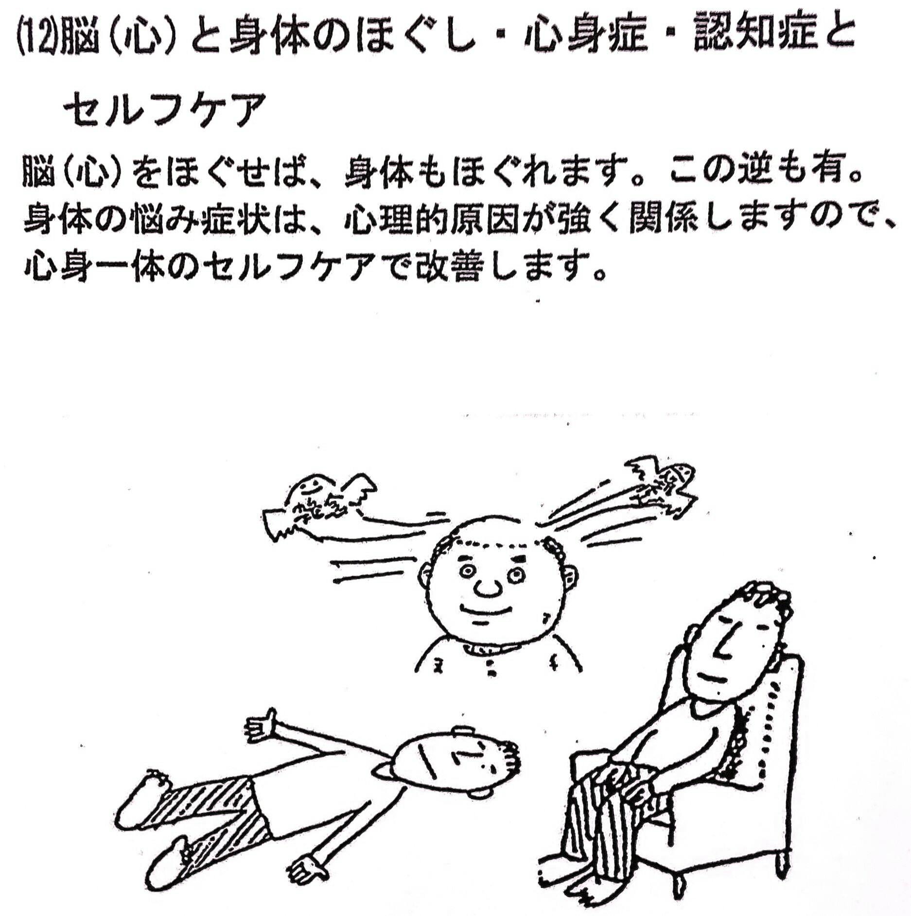 脳(心)と身体のほぐし・心身症・認知症とセルフケア脳(心)をほぐせば、身体もほぐれます。この逆もあり。身体の悩み症状は、心理的原因が強く関係しますので、心身一体の セルフケアで改善します。①スピリチュアルコントロール②マインドフルネス③ヒーリングハンズによる、頭頚部タッピング手技