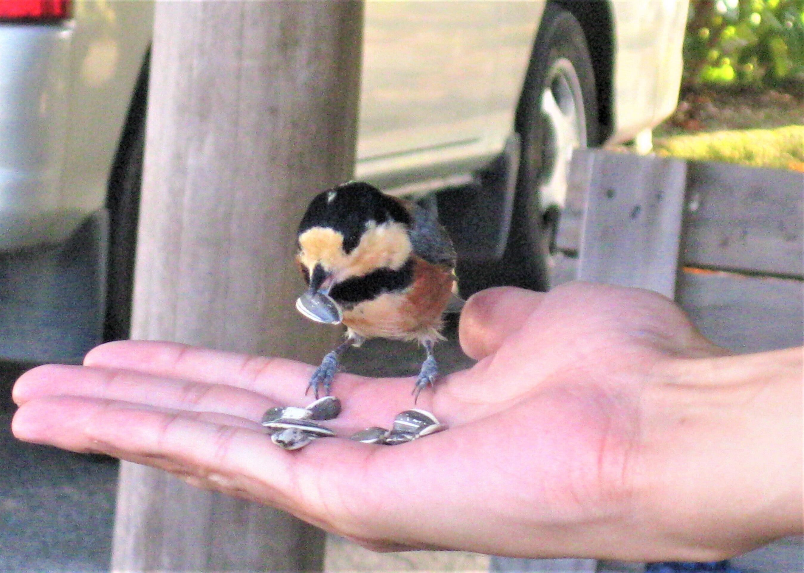 写真は、筆者の手から直接餌を食べてる野鳥です。