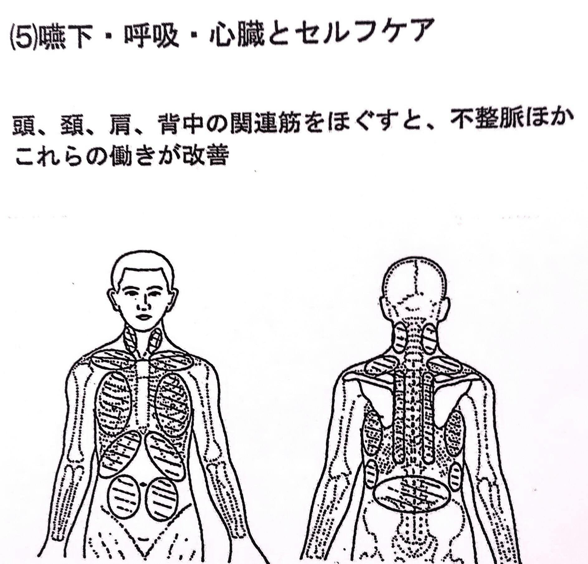 頭、頚、肩、背中、胸などの関連筋をほぐすと嚥下障害、呼吸、心臓、不整脈などが改善。