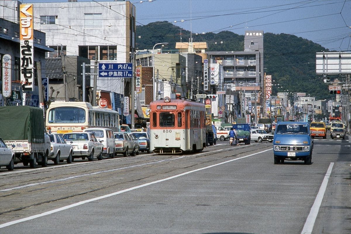 商店街の中心(国道三号線)沿いをはしる路面電車