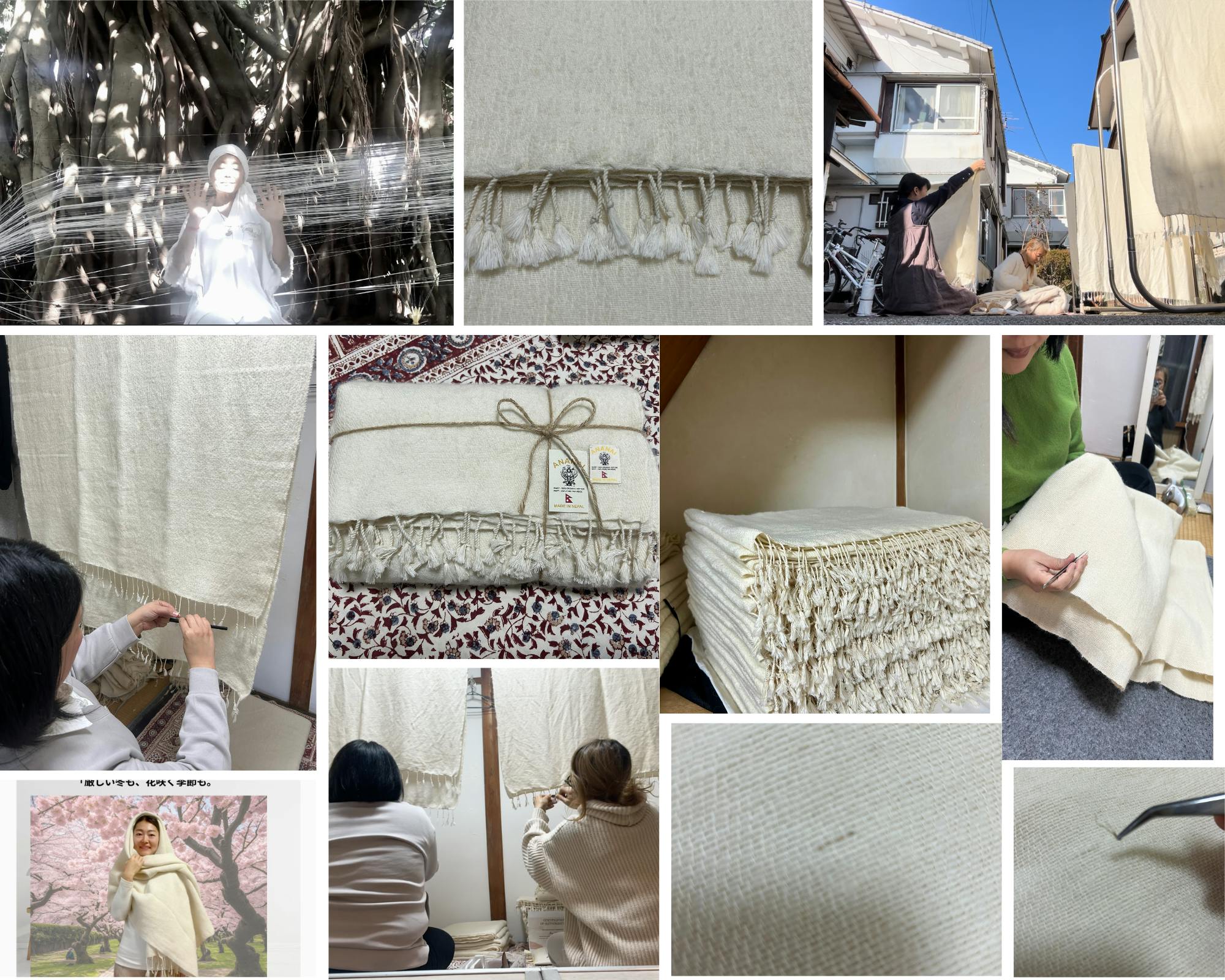 このストールは 「エネルギーが宿る一枚」。なぜなら、ネパールの職人たちが織り上げた後、日本で「祈り」 のような特別な仕上げの工程 を施しているからです。