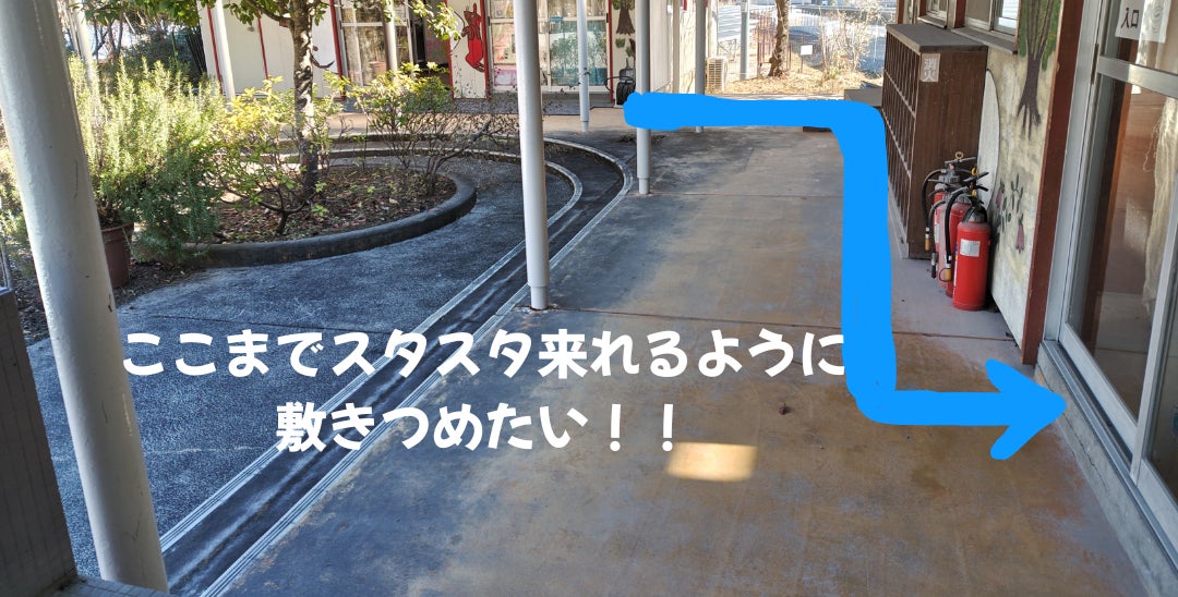 また、現在、トイレに行くために一度屋外へ出る必要があり、子どもたちもスタッフも、靴を履いて出て、トイレ入り口でスリッパへ履き替えています。部屋からトイレまで、靴を履かなくてもスムーズに移動できるように、渡り廊下を敷きたいと思っています。敷物の購入費にクラウドファンディングでいただいた資金を使わせていただきます。