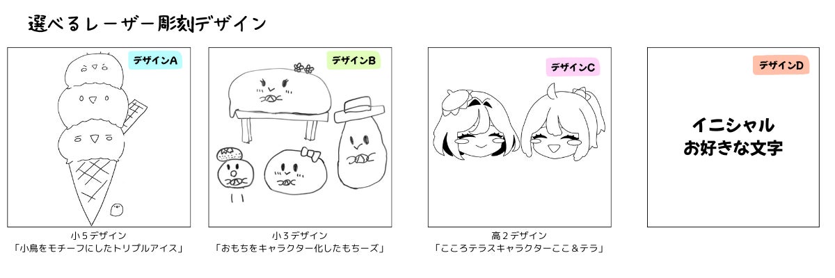 リターン品のレザー製品に施すレーザー彫刻のデザインとして、子どもたちのイラストが2種類あり、こちらもこのプロジェクトのために、子どもたちが各自でデザインしています。