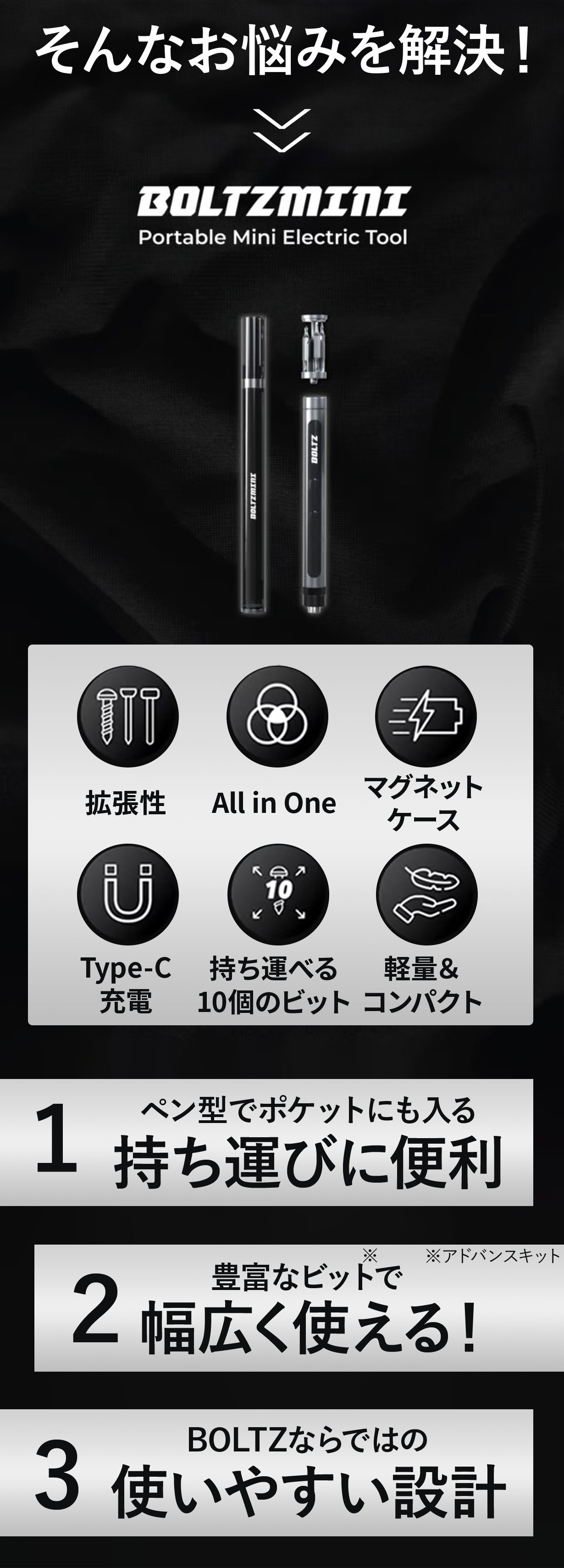 ペン型収納ケースにはドライバー本体と10個のビットを収納可能。