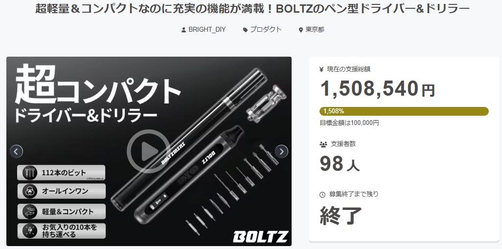 2025/05/01 00:22ご支援者様、超軽量&コンパクトなのに充実の機能が満載!BOLTZのペン型ドライバー&ドリラーにご興味をお持ちいただきありがとうございます。プロジェクト開始から53日目で98人ものご支援者の方々より支援頂き、無事プロジェクト終了を迎えることが出来ました。早速皆様のリターンを2025年05月末にお届けできるよう準備を始めております!皆様にご満足いただけるリターンをお届けできるよう、全力で取り組んで参りますので引き続き、「超軽量&コンパクトなのに充実の機能が満載!BOLTZのペン型ドライバー&ドリラー」をよろしくお願い致します。BRIGHTチーム もっと見る