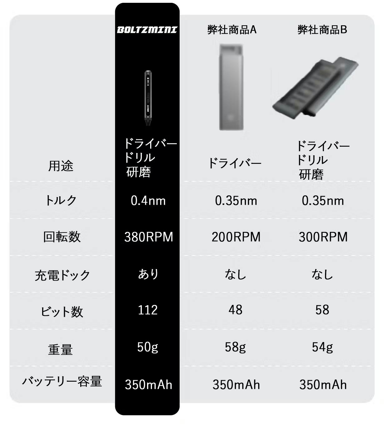 BOLTZ MINIは、単なるミニ電動ツールではなく、軽量でありながらパワフルなデバイスが必要な方にとっての完璧なソリューションです。便利なデザイン、多様な機能、先進的な技術を持つBOLTZ MINIは、あなたのプロジェクトの信頼できるパートナーとなるでしょう。今すぐBOLTZ MINIを体験し、すべての作業をこれまで以上に簡単で楽しいものにしましょう!