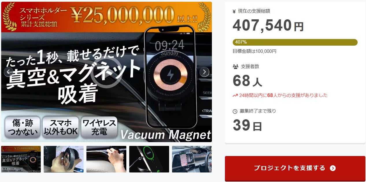 この度は「固定したままワイヤレス充電OK!真空&磁気吸着式折りたたみスマホホルダー」に支援頂き誠にありがとうございます!