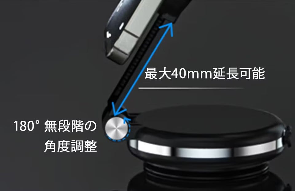 アーム部分は無段階で最大40mmの延長が可能。設置場所に合わせて見やすい角度や位置に調整しやすそうですね。