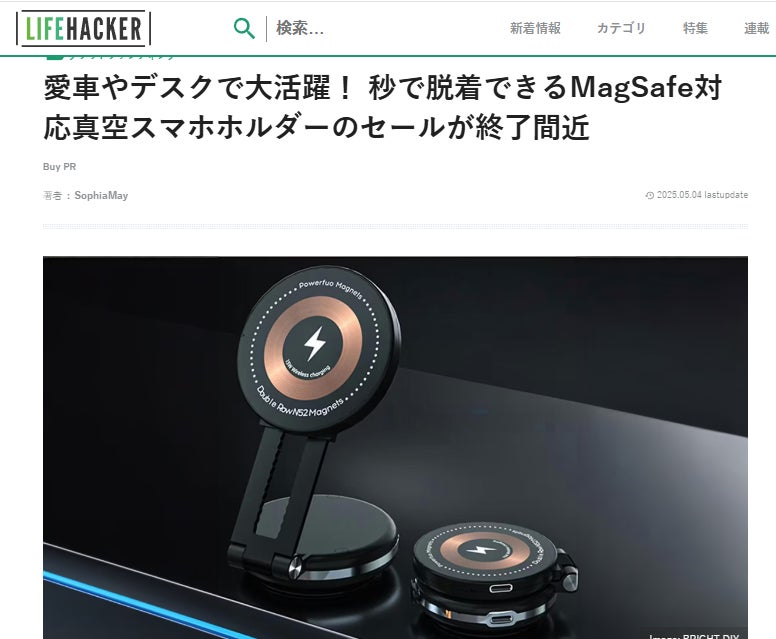 皆様、こんばんは!Brightチームです。5月4日、Lifehackerで「Vacuum Magnet (S13) 第3弾」を紹介して頂きました。話題:愛車やデスクで大活躍! 秒で脱着できるMagSafe対応真空スマホホルダーのセールが終了間近興味がある方、是非下記のリンクからアクセスしてみてください。https://www.lifehacker.jp/article/machi-ya-vacuummagnet-end-820851/【レビューの一部抜粋】〈平面ならどこでも取り付けできるのが強み使い方はとっても簡単。本体を押し付けると吸盤が真空になり、高い固定力を発揮。差し込み式やクランプ式だと設置場所が限られますが、平面ならどこでもOKなのが本製品の魅力。ボタンを押すとスッと外れるので取り外しもラク! 設置場所を変えやすいので、複数の車を乗り換える場合にも便利かと。スマホ側はMagSafeタイプの磁石式。強力なN52磁石でしっかりと固定でき、耐荷重はなんと5kg! 大きなタブレットでも安心して装着できますよ。アーム部分は無段階で最大40mmの延長が可能。設置場所に合わせて見やすい角度や位置に調整しやすそうですね。USB-Cケーブルを挿せばそのままワイヤレス充電も可能。長距離移動時でもバッテリー切れを気にせず、ナビや音楽を楽しみましょう。〉ご興味のある方はこの機会をお見逃しなく!https://camp-fire.jp/projects/820851/view5月10日まで販売期間は続きますので、ぜひSNSでのシェアや身近な方にもおすすめしていただけると嬉しく思います。#brightdiyどうぞよろしくお願い致します。BRIGHTチーム