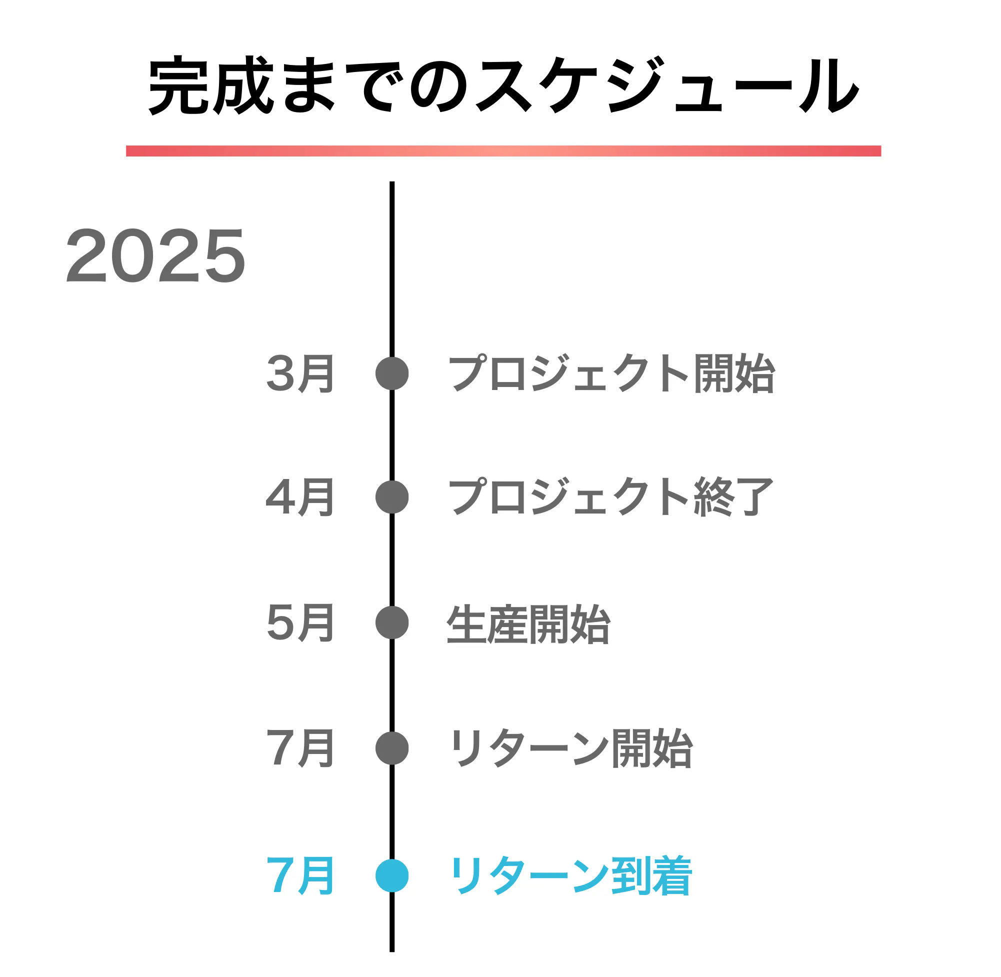 ※本文中に記載させていただいたスケジュールは、あくまでプロジェクト公開時点の予定です。クラウドファンディングの性質上、配送遅延のおそれがございます。