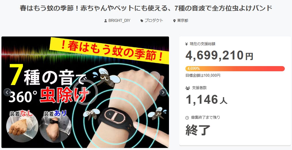 この度は「春はもう蚊の季節!赤ちゃんやペットにも使える、7種の音波で全方位虫よけバンド」に支援頂き誠にありがとうございます!お陰様で、支援総額440万円達成することができました。Ultrasonic Mosquitoの効果範囲は約20~50平方メートル。装着者本人はもちろん、この範囲内に一緒にいる方たちも蚊や虫から守ってくれます。ご興味のある方、ぜひ支援お願い致します。https://camp-fire.jp/projects/820866/viewBrightチームは、当プロジェクトをもっと多くの方に知っていただきたいと考えております。よかったら、FacebookやTwitter等のSNSでのシェア・拡散をお願い致します。#brightdiyどうぞよろしくお願い致します。Brightチーム