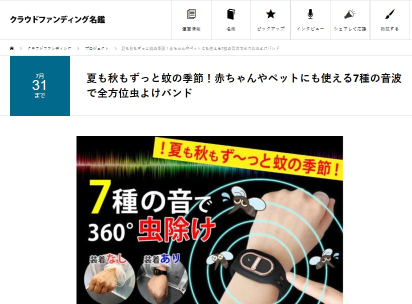 皆様、こんばんは!Brightチームです。先日、クラウドファンディング名鑑で「Ultrasonic Mosquito 第3弾」を紹介して頂きました。話題:夏も秋もずっと蚊の季節!赤ちゃんやペットにも使える7種の音波で全方位虫よけバンド興味がある方、是非下記のリンクからアクセスしてみてください。https://crowdfunding.meikan.org/project/campfire-820867/【レビューの一部抜粋】〈超音波で蚊を寄せ付けない新技術今回ご紹介する「Ultrasonic Mosquito」は、蚊が嫌がる特定の周波数の超音波を発生させることで、効果的に蚊を遠ざける画期的な蚊よけブレスレットです。薬剤や香料を使わず、臭いや刺激がないため、高齢者やお子様、妊婦さん、ペットにも安心して使えます。研究に基づいた物理的な蚊よけシステムで、虫除け効果が実験でも実証されているのが特徴です。超音波は人にはほとんど聞こえず、日常生活の邪魔にならない点も魅力的です。使いやすさと機能性を両立した設計「Ultrasonic Mosquito」はシンプルなタッチボタンで周波数の切り替えや電源のオン・オフが可能で、操作がとても簡単です。約20~50平方メートルの範囲で蚊を寄せ付けない効果があり、装着者だけでなく周囲の人も守れます。内蔵のリチウム電池はUSB急速充電に対応し、約3時間の充電で最大6日間使用可能です。防水加工も施されているため、アウトドアや急な雨の中でも安心して使えます。ただし完全防水ではないため、水中に沈めることは避けてください。安心のサポート体制と今後の展望本製品は中国のZhejiang Sorbo Technology Co., Ltdが製造し、日本のBRIGHT DIYが正規代理店として日本市場に紹介しています。6ヶ月間の品質保証と日本語カスタマーサポートが付いているため、安心して利用できます。今後も改良を重ねながら、多くの方に快適で安全な蚊よけ環境を提供していく予定です。詳しくはプロジェクトページをご覧ください。〉ご興味のある方はこの機会をお見逃しなく!https://camp-fire.jp/projects/820867/view7月31日まで販売期間は続きますので、ぜひSNSでのシェアや身近な方にもおすすめしていただけると嬉しく思います。#ultrasonicmosquito #brightdiyどうぞよろしくお願い致します。BRIGHTチーム