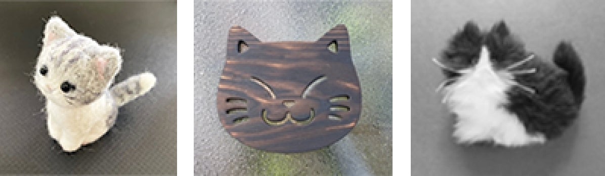羊毛で作った「小さな癒し猫」と「木製のねこ顔」