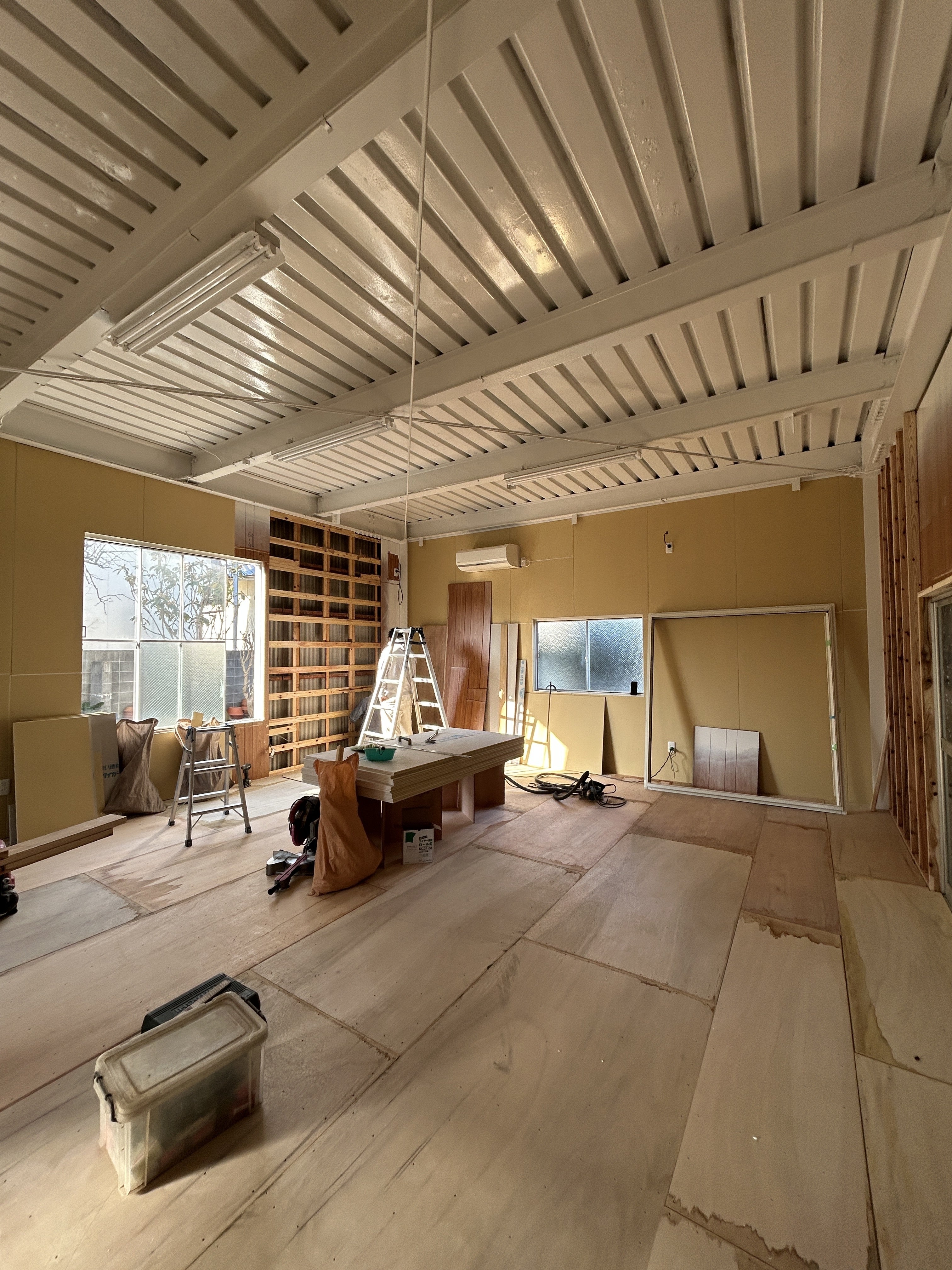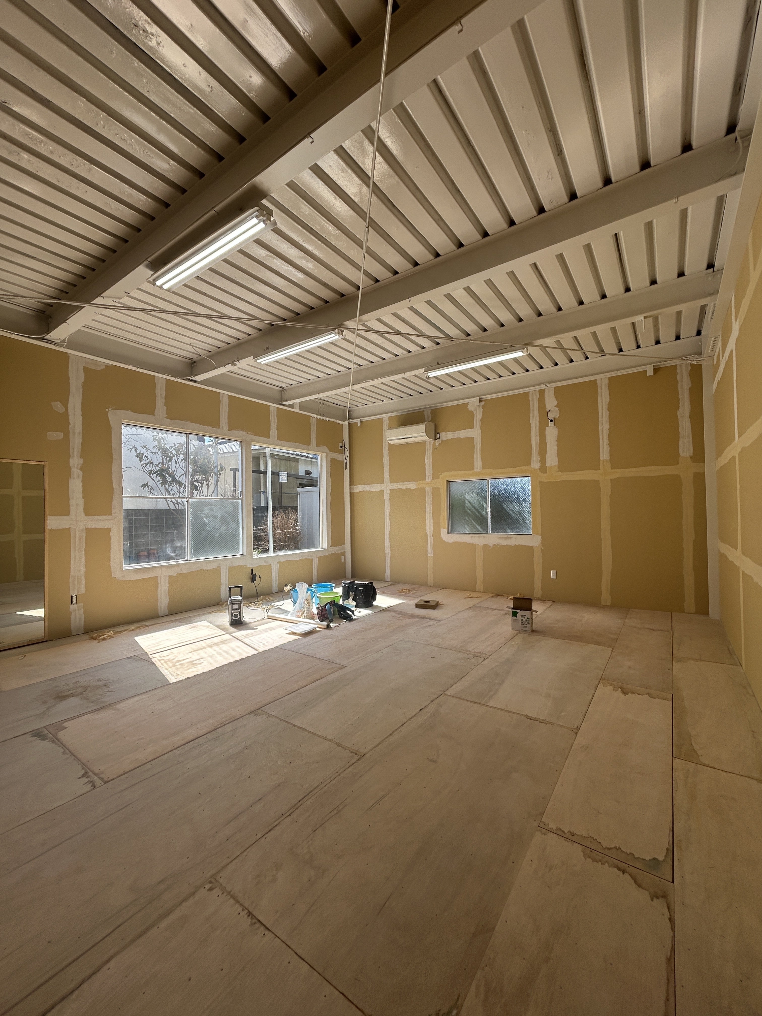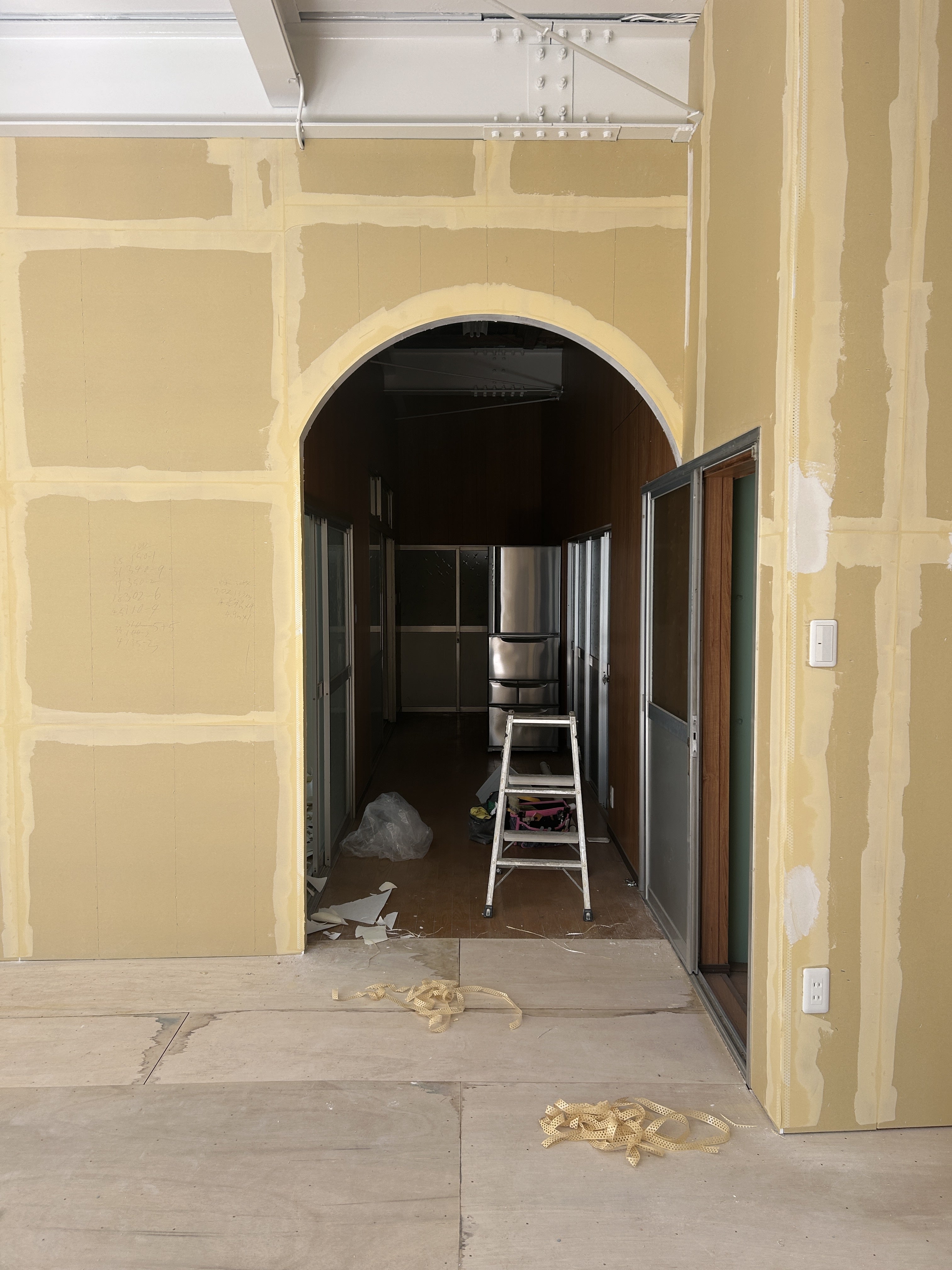 すでに窓枠の増設とアーチ型の入口が完成し、スタジオの雰囲気が少しずつ形になってきています!!