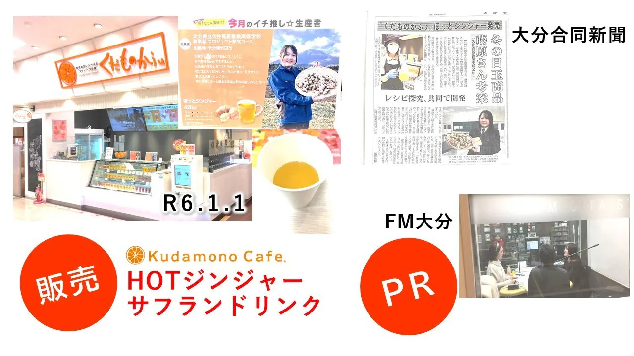 ✔認知度向上のため地元シェフとのコラボ商品を展開。YouTubeでも大人気の大阪のリストランテのシェフに依頼し、本校のサフランを使用した調理動画を発信。さらに、くだものかふぇでのホットジンジャーサフランドリンクの販売を実現。大分県内の新聞・ラジオといったメディアでのPR活動も積極的に行いました。