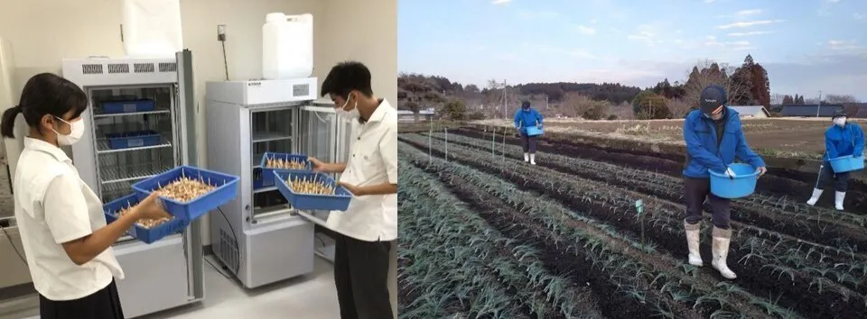 ✔球根肥大を効率的に行うことを目的に水耕栽培にも取り組んでいますが、思い通りの結果を得るには至っていません。実験方法を変えながら引き続き研究活動に取り組んでいます。never give up !!
