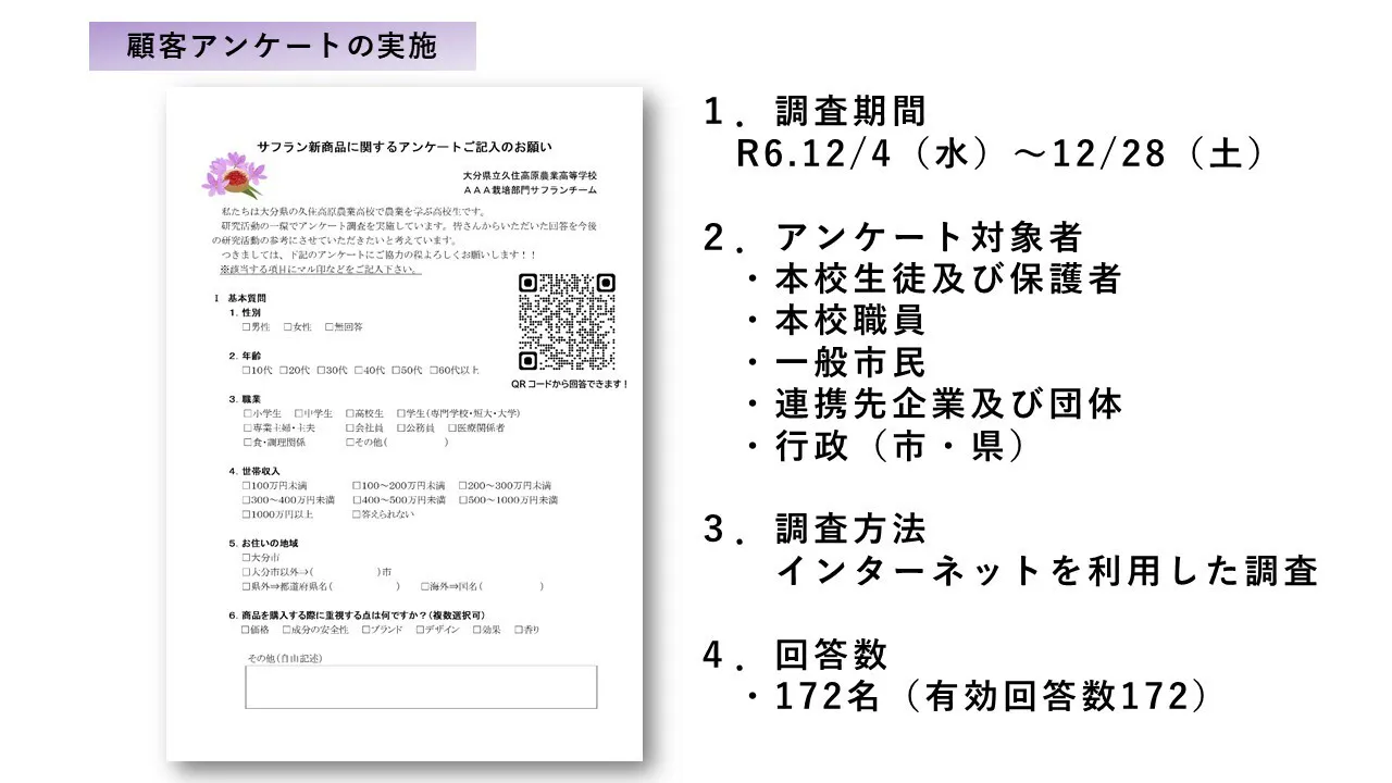 私たちは、潜在的な顧客ニーズを把握するためのアンケートを作成。本校生徒・保護者・職員ならびに、市民や企業・行政など、約170名の方から回答をいただくことができました。