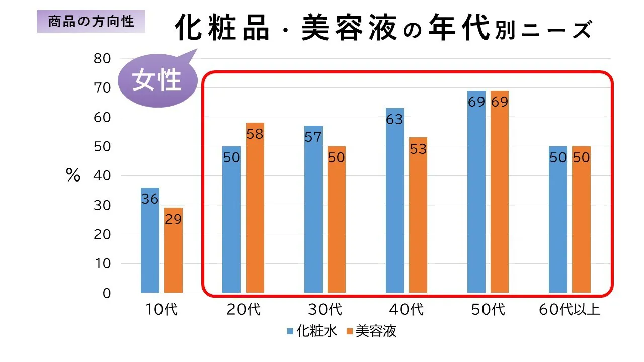 調査の結果、スキンケア商品のニーズが高く、最も支持を得たのは化粧水と美容液。