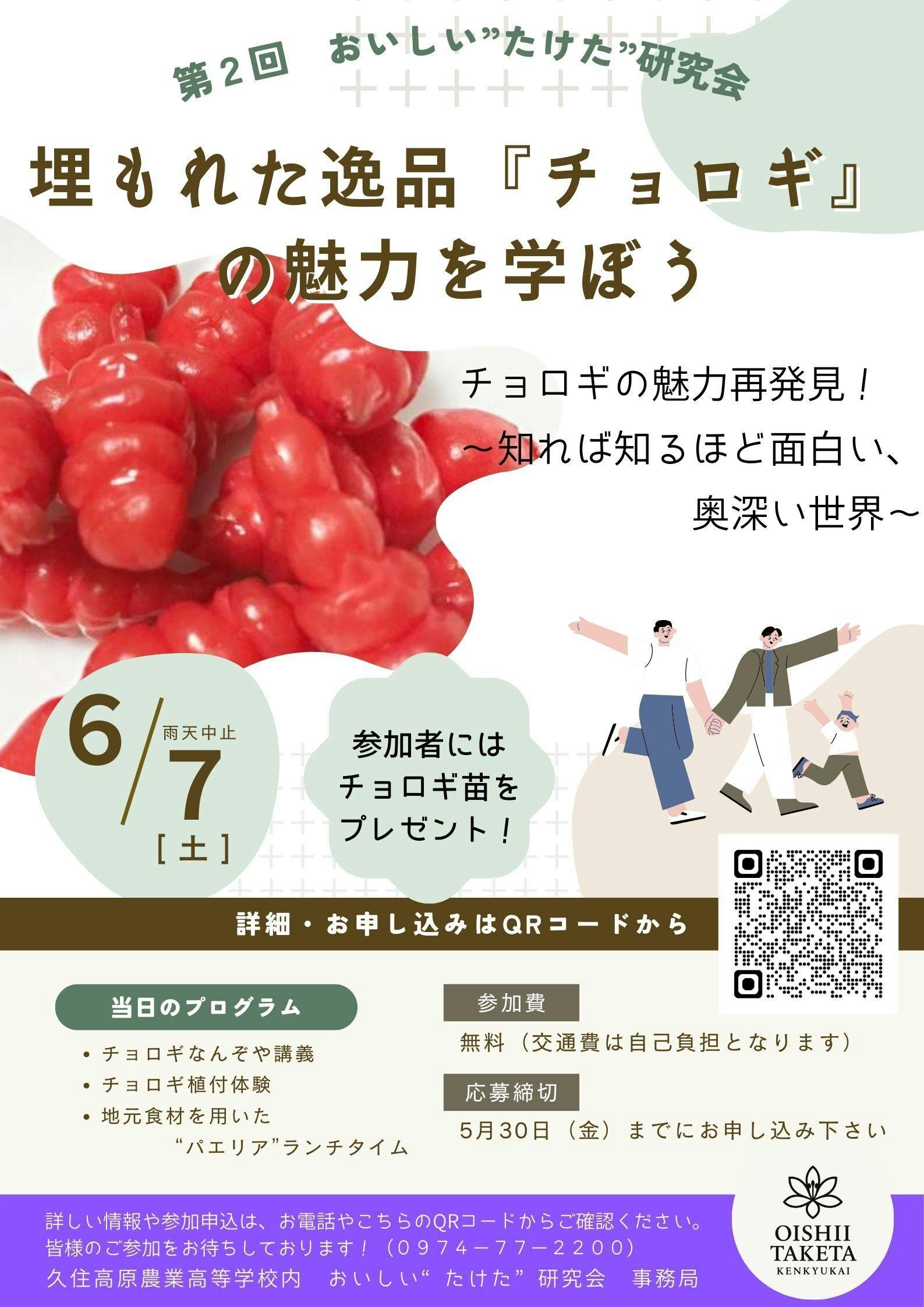 皆さま、いつも温かいご支援と応援をありがとうございます。久住高原農業高校の生徒たちと市民の皆さんがともに学び、地域の食文化を未来へつなぐプロジェクト、「おいしい“たけた”研究会」。おかげさまで、第1回の活動を無事に開催し、多くの笑顔と学びが生まれました。そしてこのたび、第2回の研究会の開催が決定いたしました!今回のテーマは、「チョロギ」。古くから竹田の一部地域でひっそりと栽培されてきた、小さくてくるんとかわいい、希少な植物です。"竹田に眠る食文化の“たからもの”を見つけて育てよう!”チョロギは、全国でも珍しい伝統野菜で、近年ではその存在すら知られなくなりつつあります。そんな「埋もれかけた宝もの」を、今あらためて見つけ、学び、育てていくこと。それが私たちの研究会の使命です。今回は、チョロギの歴史や栽培の知識に触れる勉強会とあわせて、地元竹田の食材の魅力を活かしたシェフによる“サフラン香るパエリア”のふるまい昼食会も実施予定です。前回同様、地元の皆さんとの交流を通して、「竹田の食っていいな」と思えるひとときをつくります。【第2回 おいしい“たけた”研究会 概要】 1.日時 令和7年6月7日(土)10:00~13:30(受付9:30~) 2.会場 大分県立久住高原農業高等学校 3.内容 ・ チョロギの基礎講座(来歴・特徴・栽培・調理) ・ チョロギの植付体験 ・ 地元シェフによるパエリアづくり・昼食交流 ・ 意見交換会 4.対象 本研究会会員・市民参加者・関係者 など 5.参加費 無料(※交通費は自費でご負担ください) 6.持ち物 作業服、長靴、帽子、手袋、タオル、水筒【お願い】 ○出欠の確認のため、参加をご希望の方は以下のQRコードもしくはURLよりご回答ください 《QRコード・URL》 https://forms.gle/qy1ZiMe7K1nqcYmD7※ご記入いただいた個人情報は、本研究会の運営以外の目的では使用いたしません。※添付のチラシは、周囲の方へのご案内・共有などにご自由にお使いください。ぜひ、あなたも一緒に小さな町の、小さな農業高校で始まったこの研究会。でも私たちは信じています。「食」は地域を元気にする力があると。そして、その力を育てるのは、特別な誰かではなく、この場所を愛する一人ひとりの想いです。今回の勉強会も、皆さまからいただいたご支援があってこそ実現できるものです。改めて心より感謝申し上げます。ぜひ、お近くの方はご参加を。遠くから応援してくださっている皆さまも、どうかこれからの活動を引き続き見守っていただければ嬉しいです。今後も活動報告を随時更新してまいります。どうぞ引き続きのご支援・ご声援をよろしくお願いいたします!