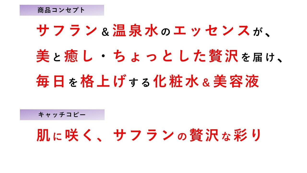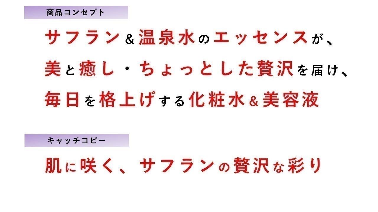 この先の製品設計において、サフランから独自抽出されたエキス※3 の濃度や処方内の配合量によっては、色や香りが製品全体に強く反映されない場合があります。その場合は、サフランの持つ希少性や高機能性を中心に訴求し、製品の価値を最大限に引き出してまいります!