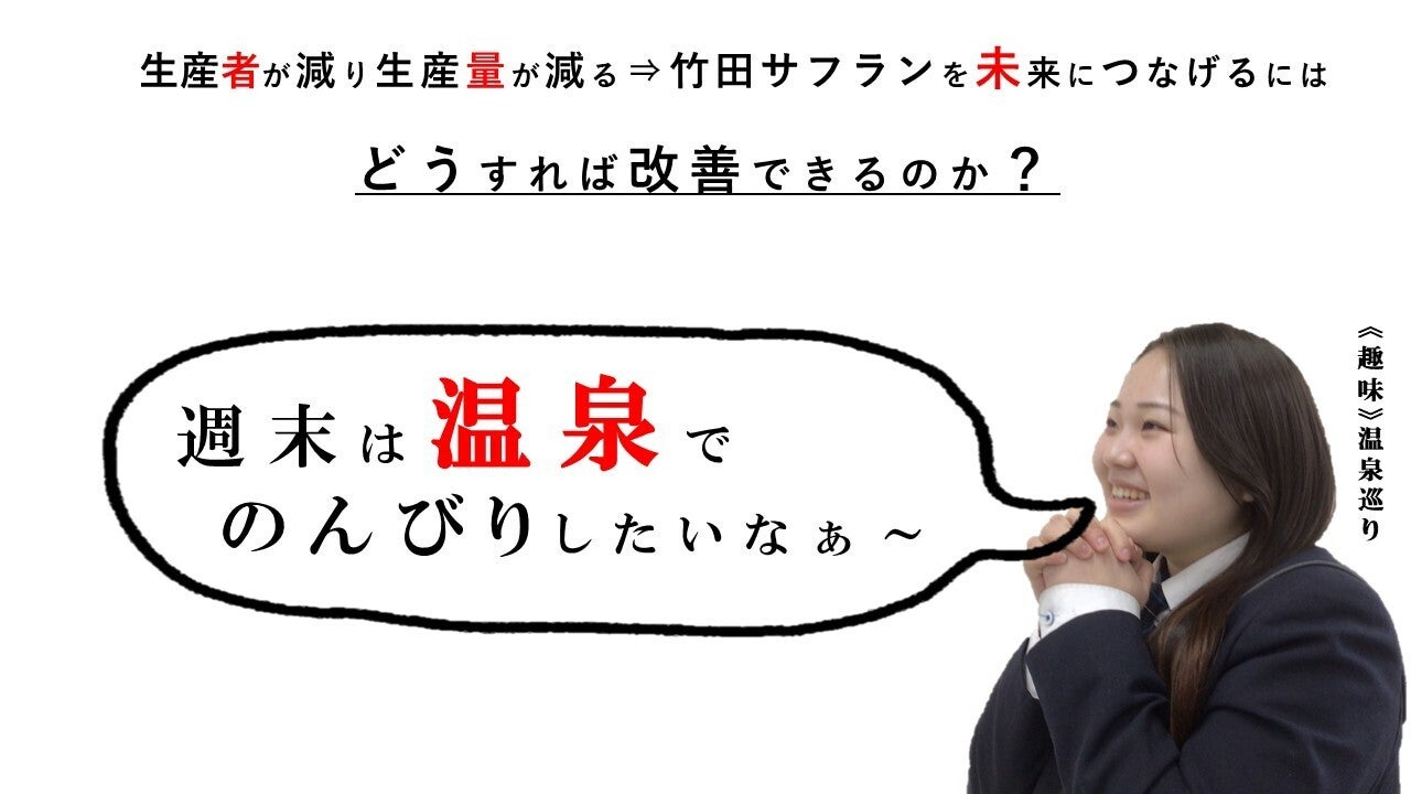 おいしいでつながってきた「たけたの食」の魅力を、サフランの課題解決に取り組むことによって、高校生の私たちの視点や発想で未来に繋げる提言を行っていきたいと思います。